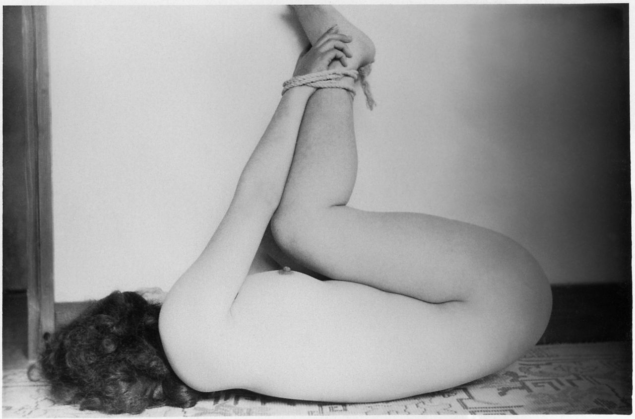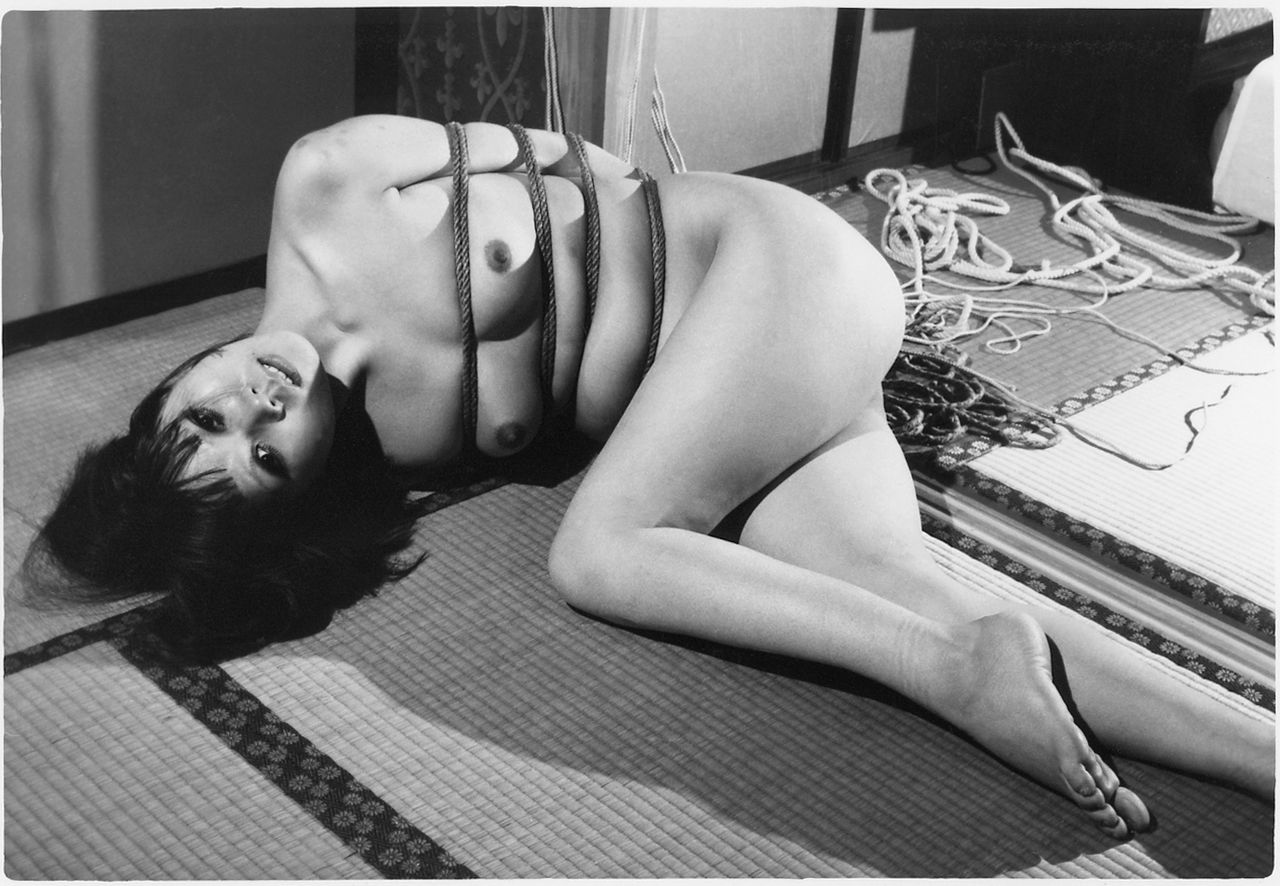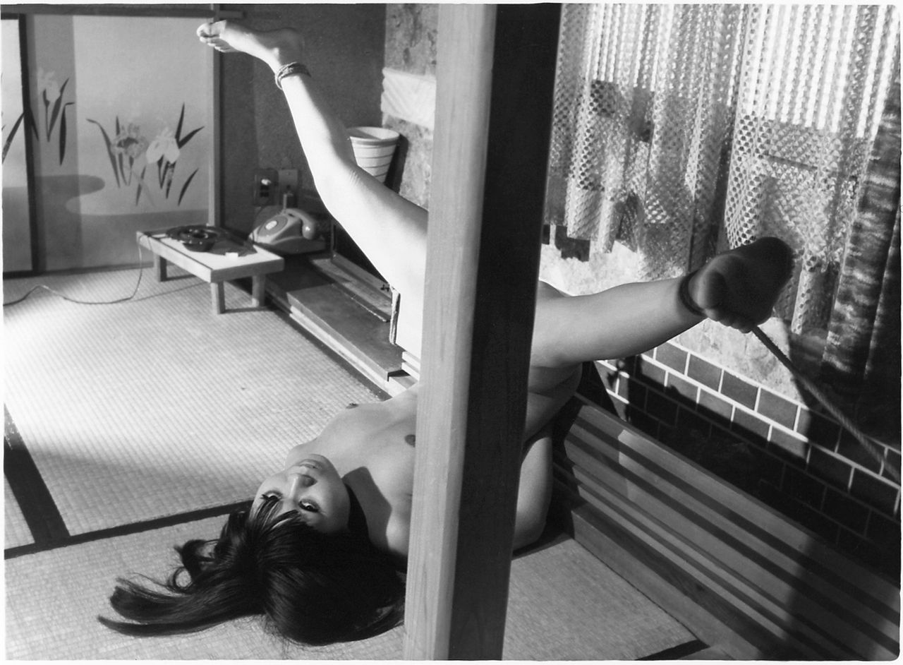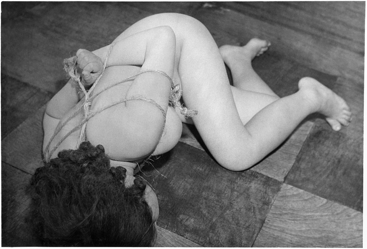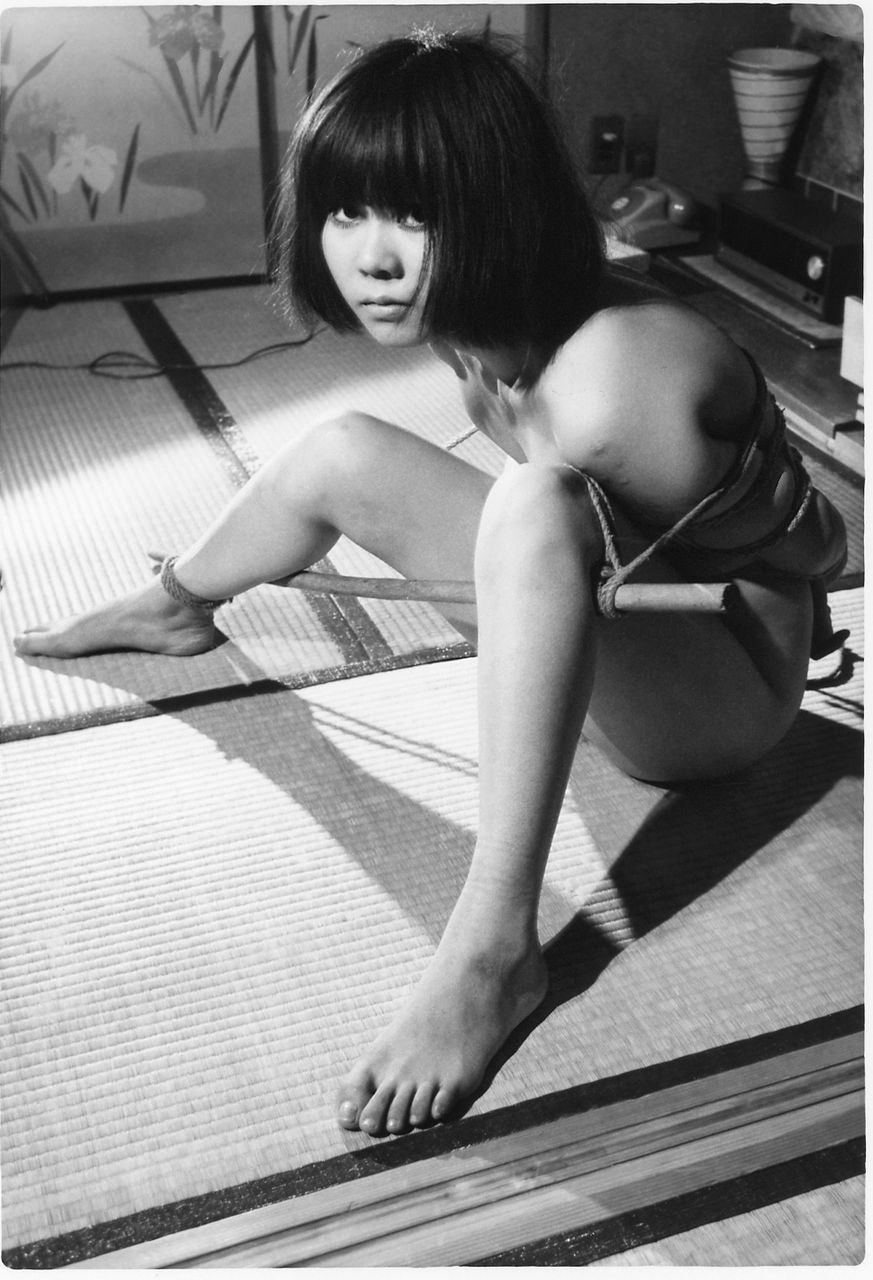 斑紐による緊縛。71年だとアンブレラストロボは使えたはずですが、500ワットフラッド球3発の照明です。無理なポーズで長いシャッターは無理だったと思いますが、上からの照明を近づけて照度を稼いでいます。その分大分硬い画面になりました。
