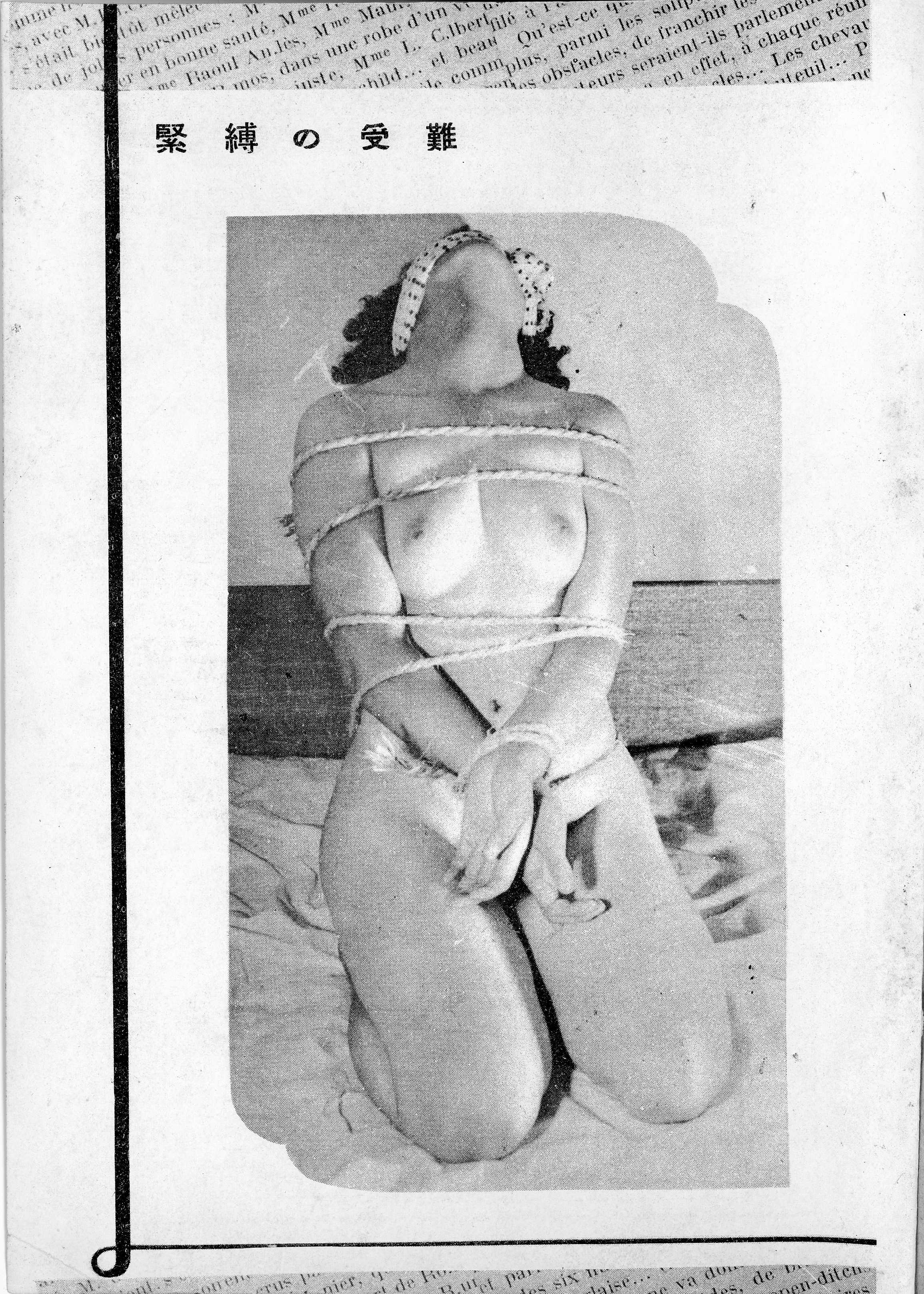 119−21) 深田菊子嬢白の綿ロープらしきものでの緊縛。緩い縄掛けと見えますが手首から先は変色しています。散らばっているロープは黒なのか赤なのか分かりません。