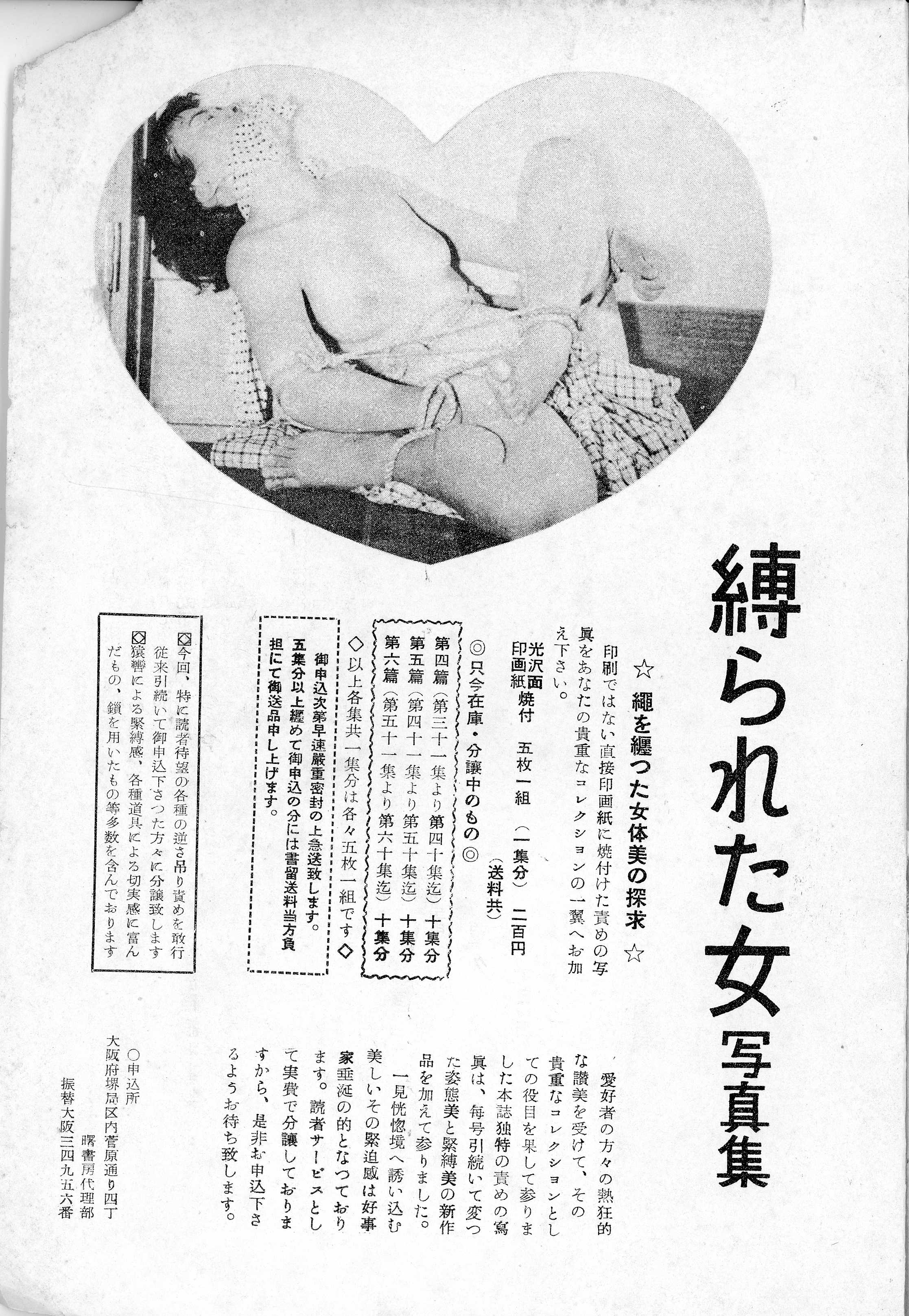119−37) 深田菊子嬢ここまでのポーズを付けても浣腸器などは見つかりません。111頁もHASSAN様からの写真にはエネマシリンジが写っています。71年9月号のエネマシリーズも、ある部分は普通の緊縛写真と同時に撮影されていたのかも知れません。