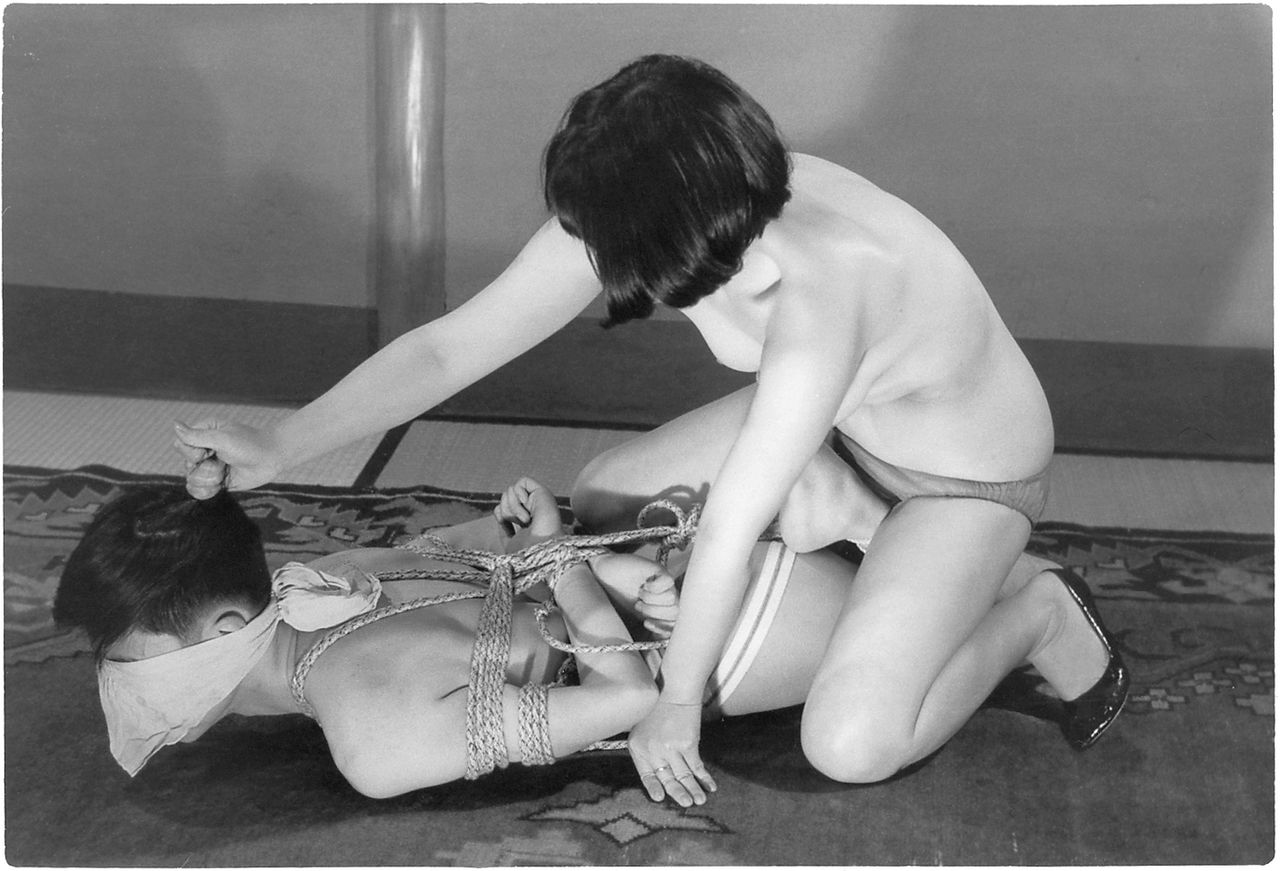 125-37) 大塚啓子・山原清子(まめ)? マゾフォト37(まり)『汚臭と足舐の強制』、「女の肌にじかにつけていたパンティを頭にかぶせられ、口に押し込まれても、縛られている身の男にとっては、どうすることも出来ない。やがて女の足指が無理矢理口へ押し込められる。拒否しょうにも他の一人の女が頭を押さえて逃がさない。二人の女による強制が、いつの間にか男を恍惚たる被虐の花園へさそい込んでしまう。」