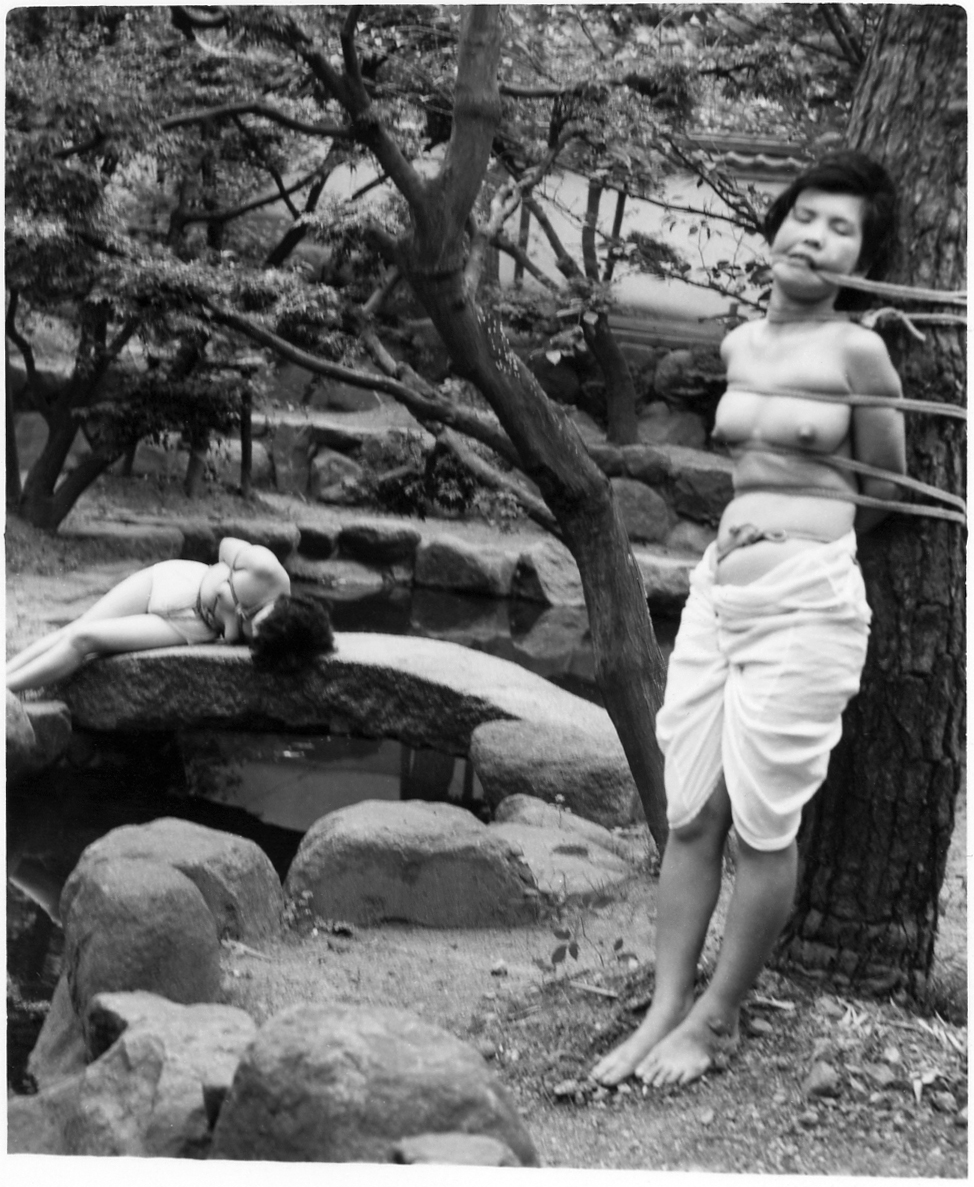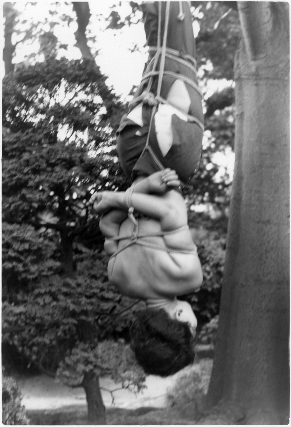 149−02) 木村洋子02 これが木村洋子のデビュー作です。初出は大中判でしたが、この印画は大手札版ですので65年7月のK組49の『立木より逆さ吊り』でしょう。Z組64の可能性も無いではありませんが・・・ 96頁で白川様から頂戴した写真と同時撮影ですが、別のカットです。