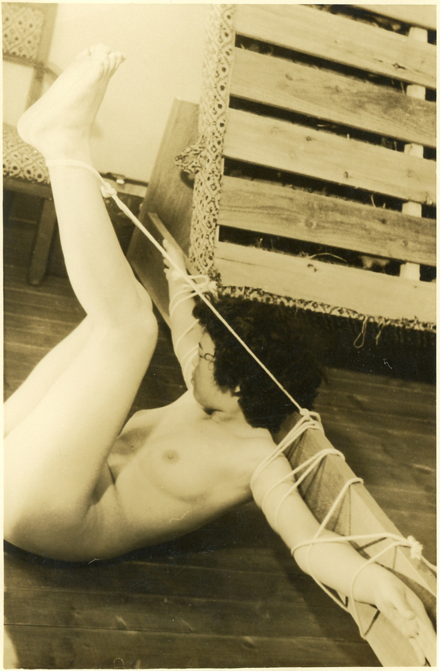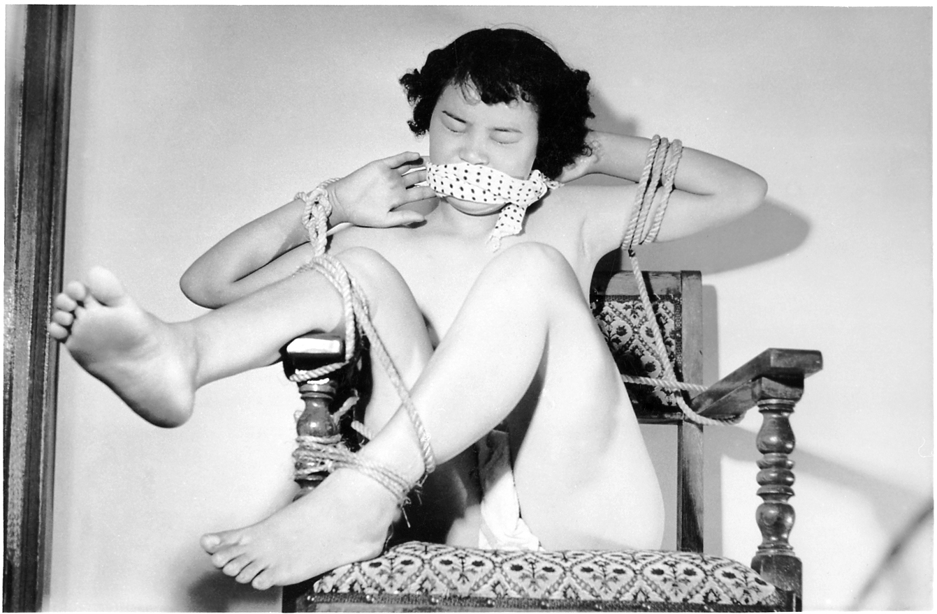 さして変色しておりませんでしたので、モノクロのみご覧下さい。黒いところと白いところが極端で、スペクトルをいじって何とか中間部を復活したかったのですが、やや不自然になったようです。152-04) 和室での縛り。