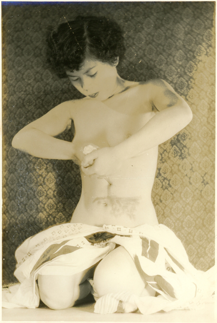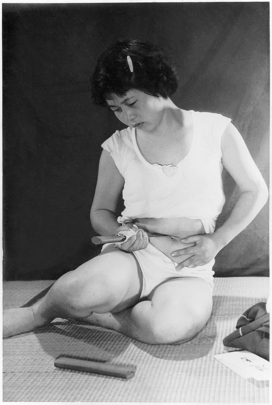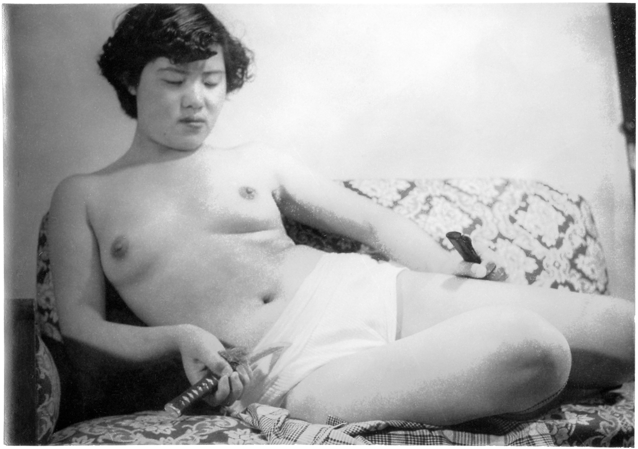 158-00 の「切腹擬態写真」の同モデル同時撮影分です。髪飾りに特徴がありますが、モデルは誰でしょうか。