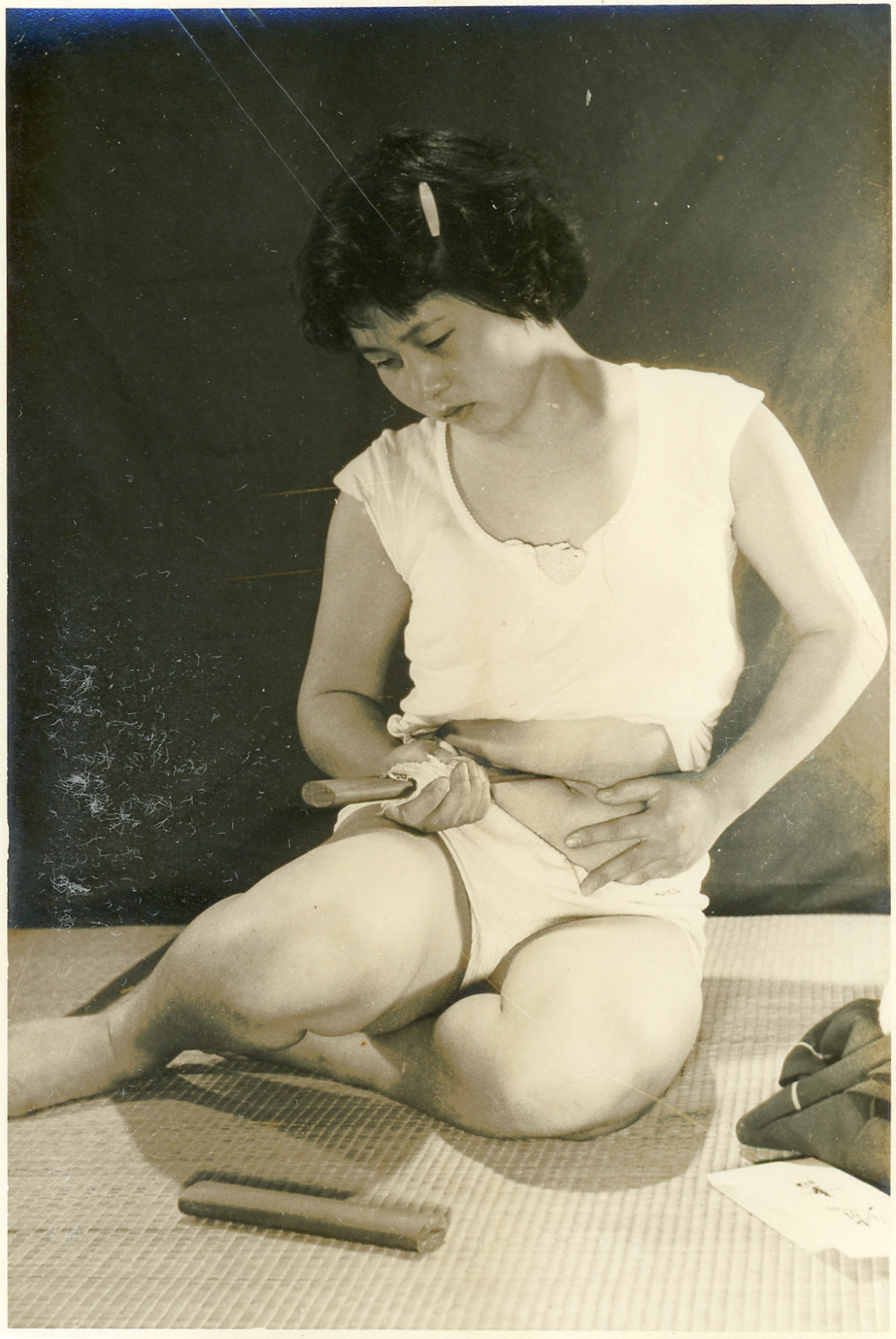 奇譚クラブ 1954年10月号のオフセットページに「女性切腹画2題」として、靱和仁古の名で絵画と「切腹擬態写真」一葉が掲載されています。一方、同年1月号では「女性切腹姿態 第一集」 手札6枚組が発売、解説は「熱烈な要望により、川合伊都子さんから送られた写真を参考にして新に撮映したものを加えてこゝに第一集を発表した。切腹マニアの一見を希望する。」となっております。切腹マニアから、絵や写真の提供を受け、それを元に写真撮影したという意味でしょうか? 真実そうなのか、悪書に眼を光らせている官憲への方便なのか、私には判りません。