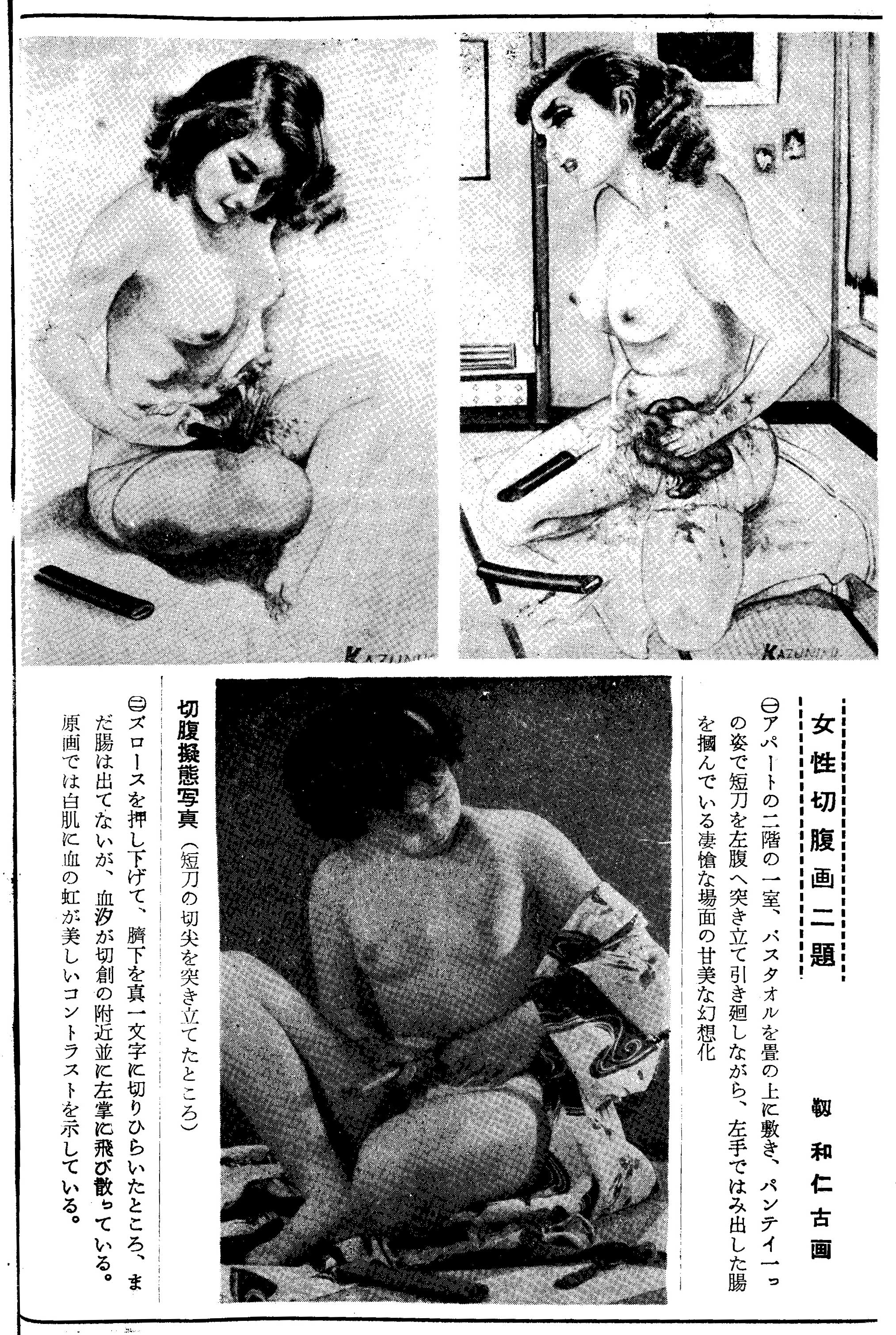 奇譚クラブ 1954年10月号のオフセットページに「女性切腹画2題」として、靱和仁古の名で絵画と「切腹擬態写真」一葉が掲載されています。