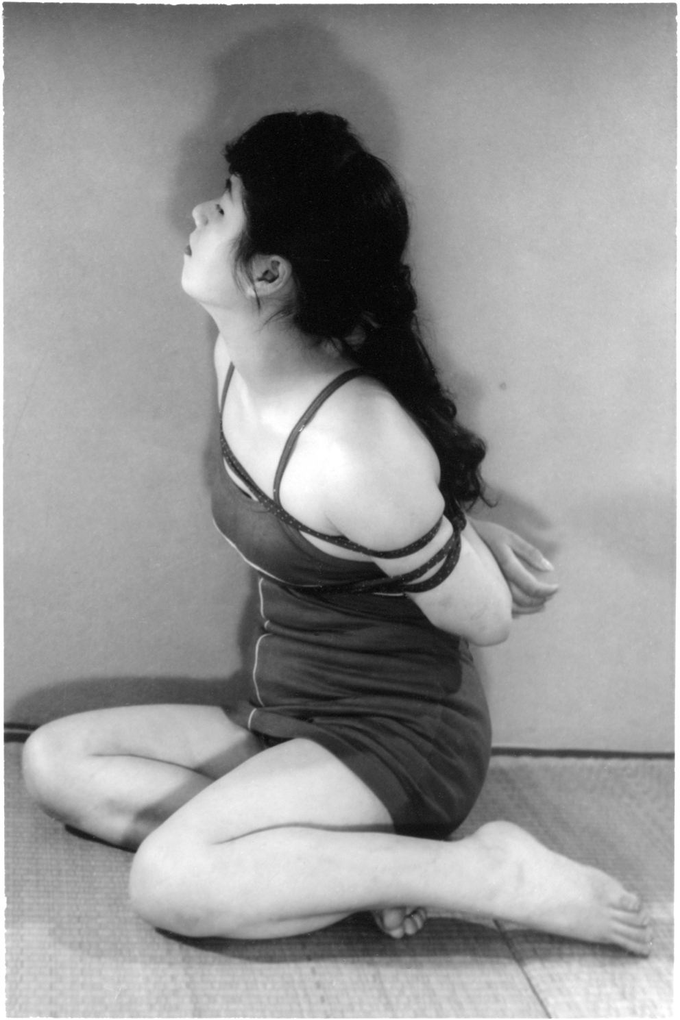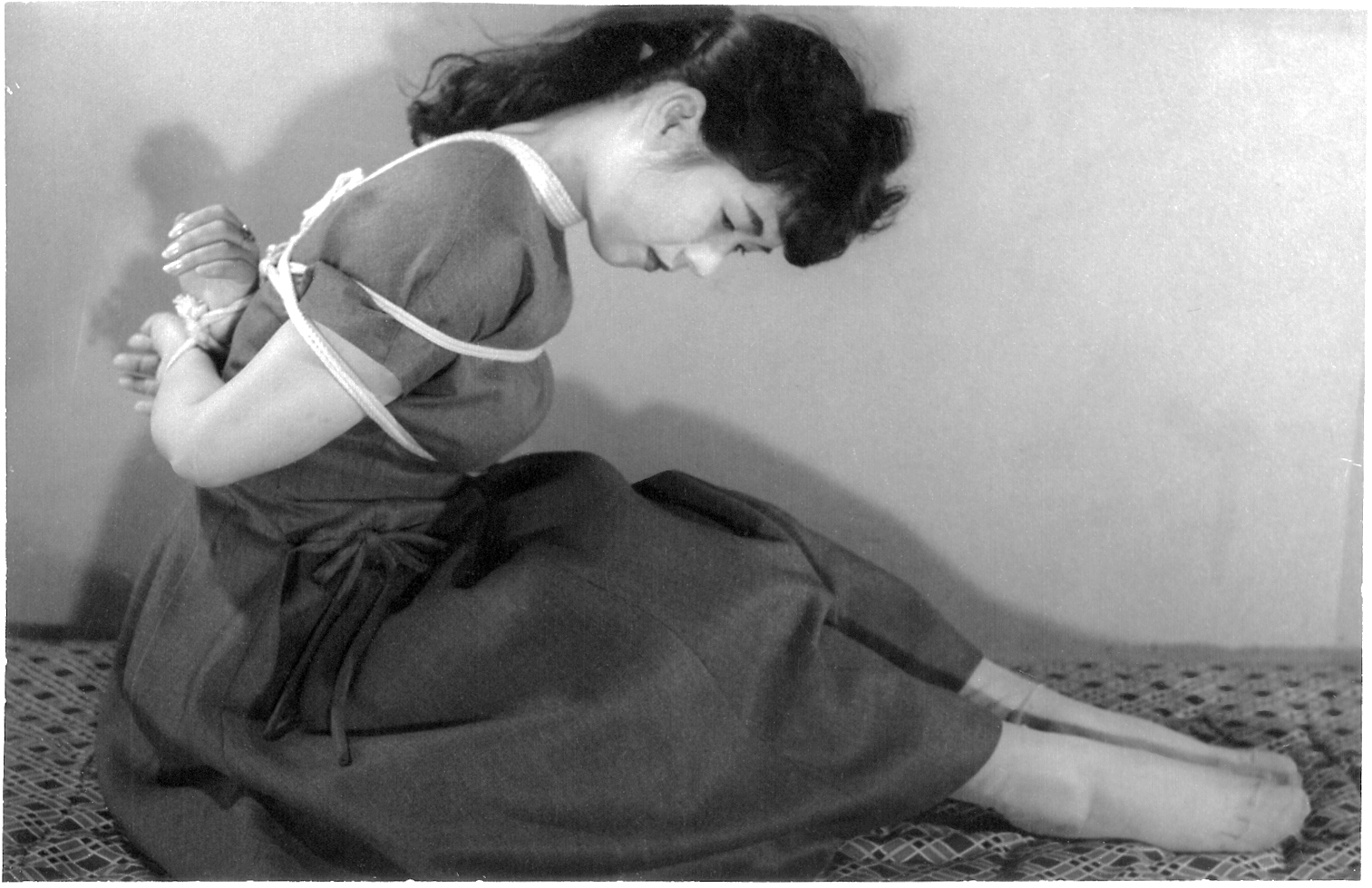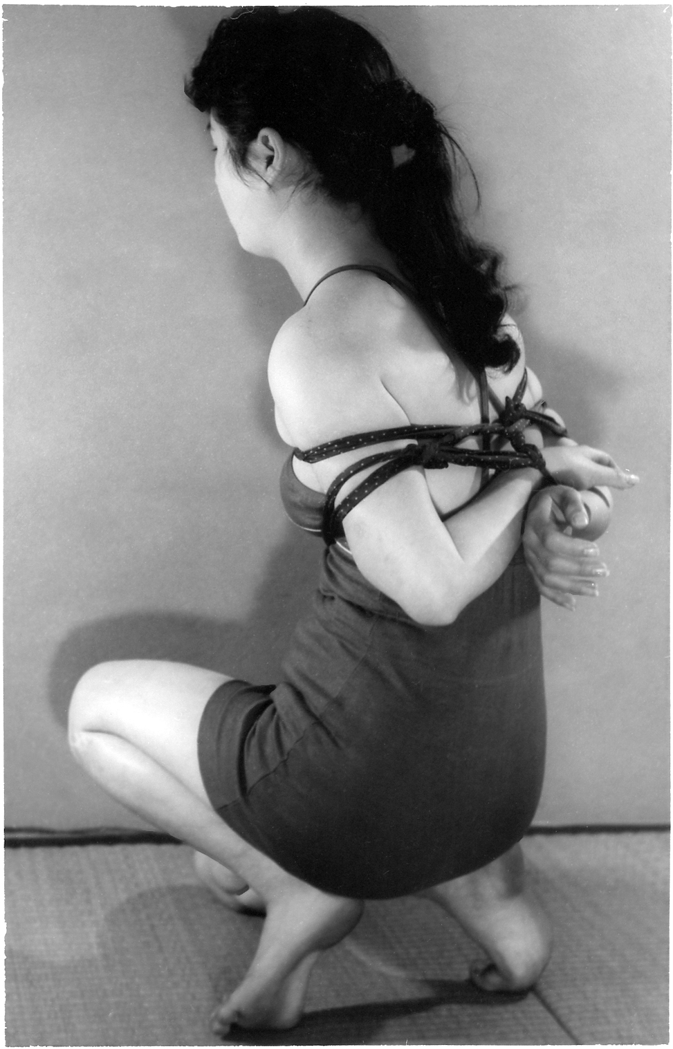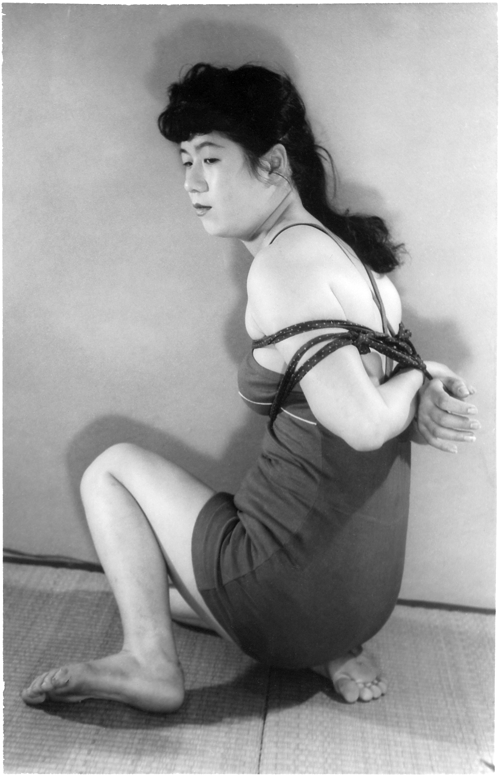 前項写真と同時発売の大手札サイズ5枚組。解説は「ひしひしと肌に喰い込む縄目にこらえながら、じっと奥歯をかみしめて、懸命に、前、後、横とさまざまのポーズをとって、十九の乙女の緊縛姿態を余すところなく開陳したコレクシヨン・フォト。」となっております。