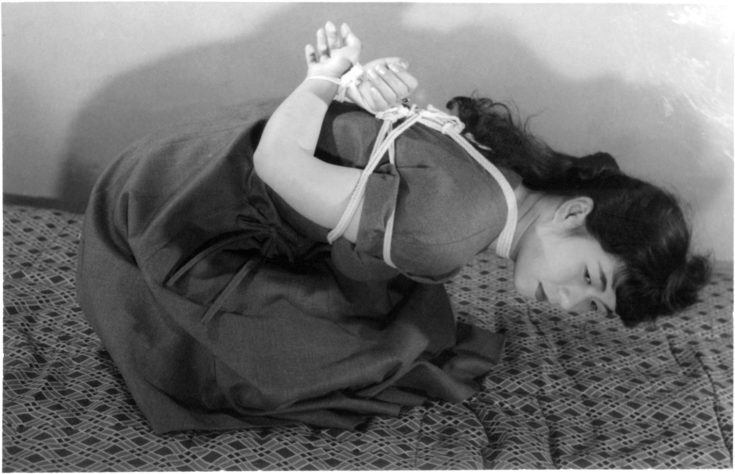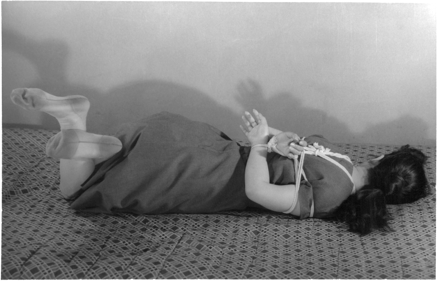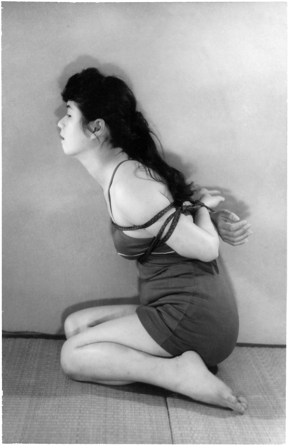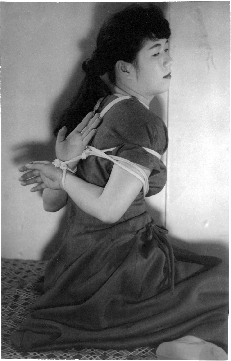 前項写真と同時発売の大手札サイズ5枚組。解説は「ひしひしと肌に喰い込む縄目にこらえながら、じっと奥歯をかみしめて、懸命に、前、後、横とさまざまのポーズをとって、十九の乙女の緊縛姿態を余すところなく開陳したコレクシヨン・フォト。」となっております。