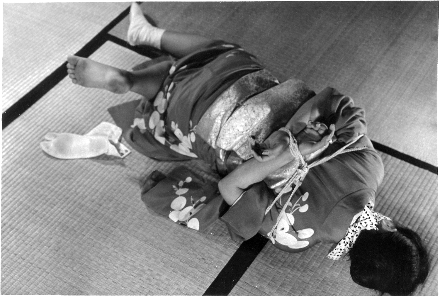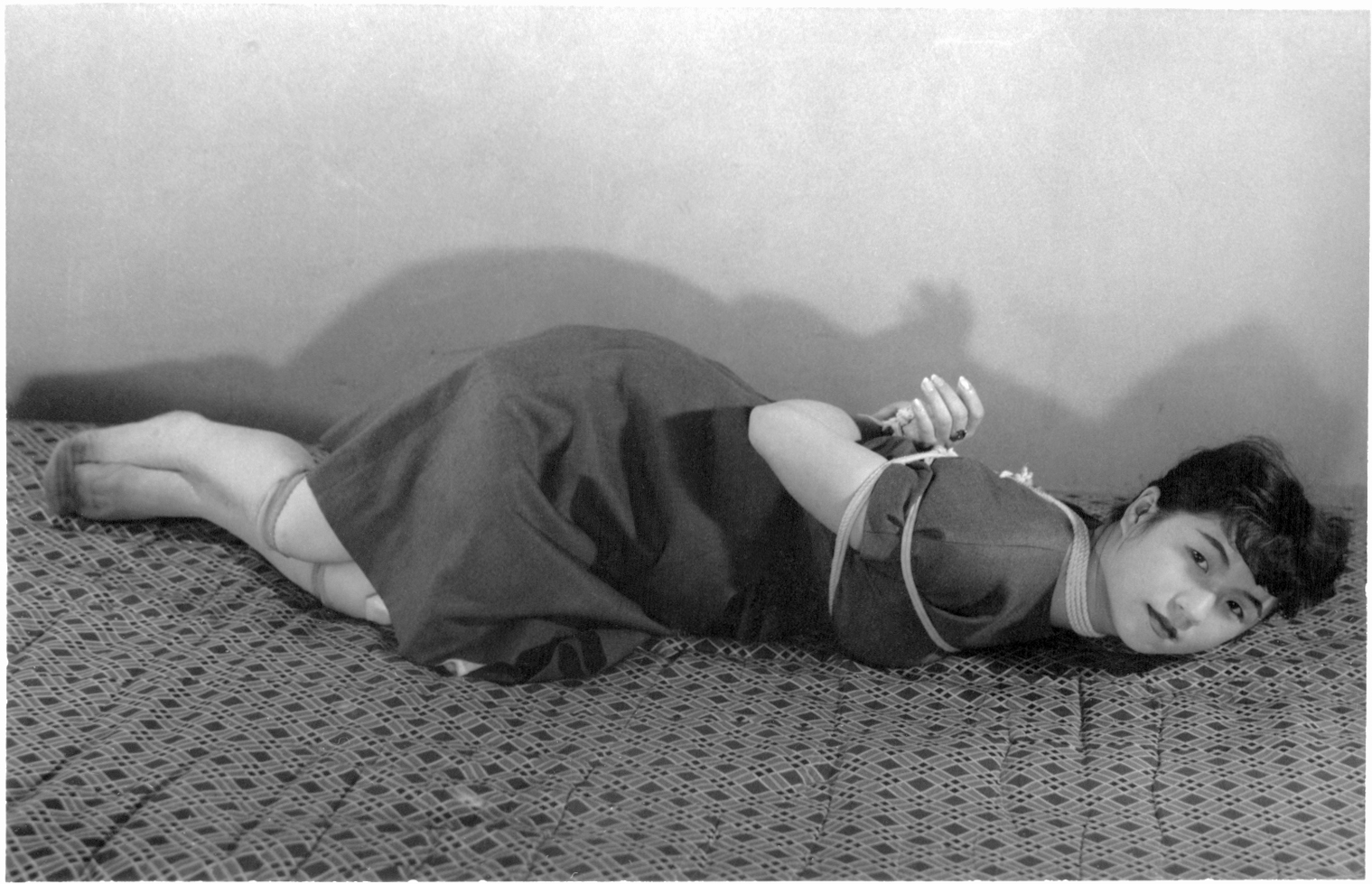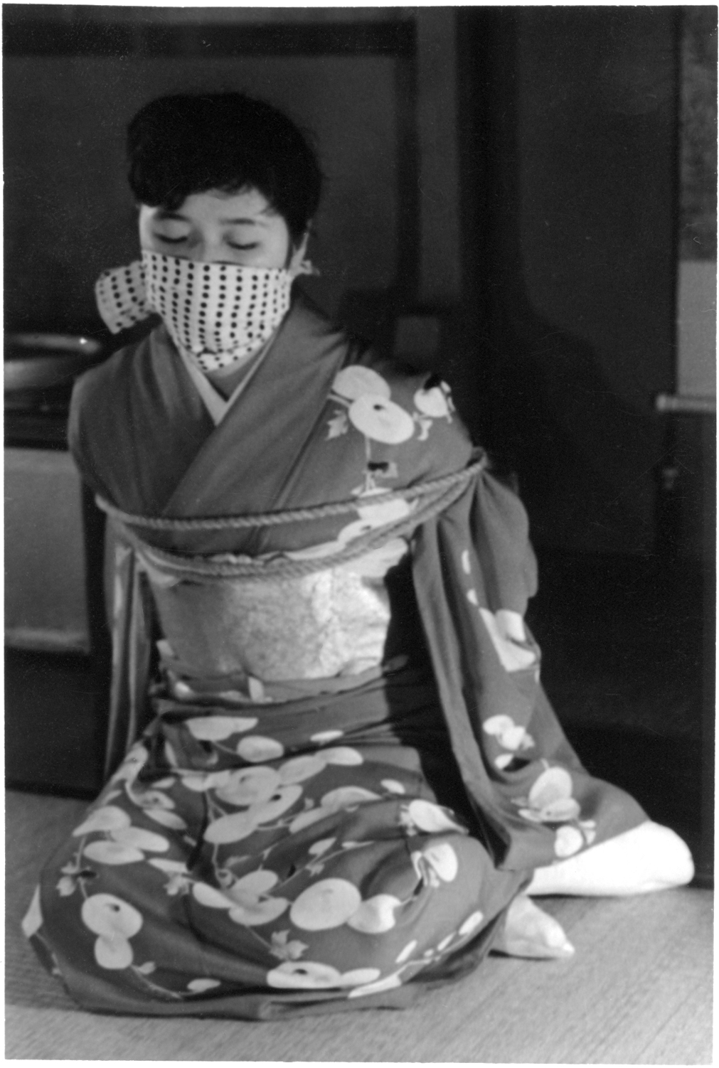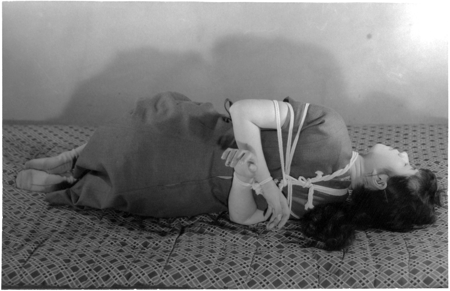 前項写真と同時発売の大手札サイズ5枚組。解説は「ひしひしと肌に喰い込む縄目にこらえながら、じっと奥歯をかみしめて、懸命に、前、後、横とさまざまのポーズをとって、十九の乙女の緊縛姿態を余すところなく開陳したコレクシヨン・フォト。」となっております。