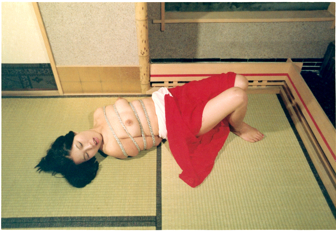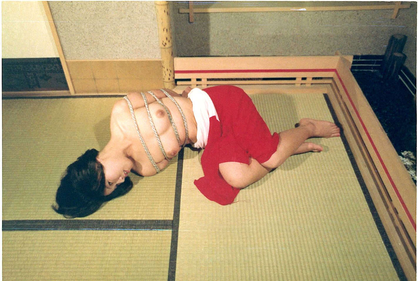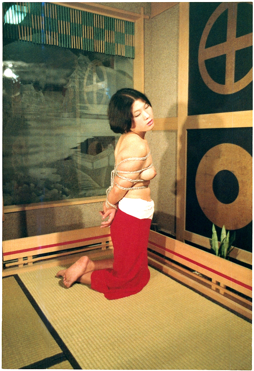 大塚嬢単独のカラー写真は7組24枚。腰巻着用と両手吊り3組9枚ですので、残りは4組15枚で、その全部をここに掲載いたします。前項では「まだら縄」を棄て「柱に縛りつけ」を採って(てか)としましたので、ここに(てく)(てこ)(てま)計11葉が残ったわけです。