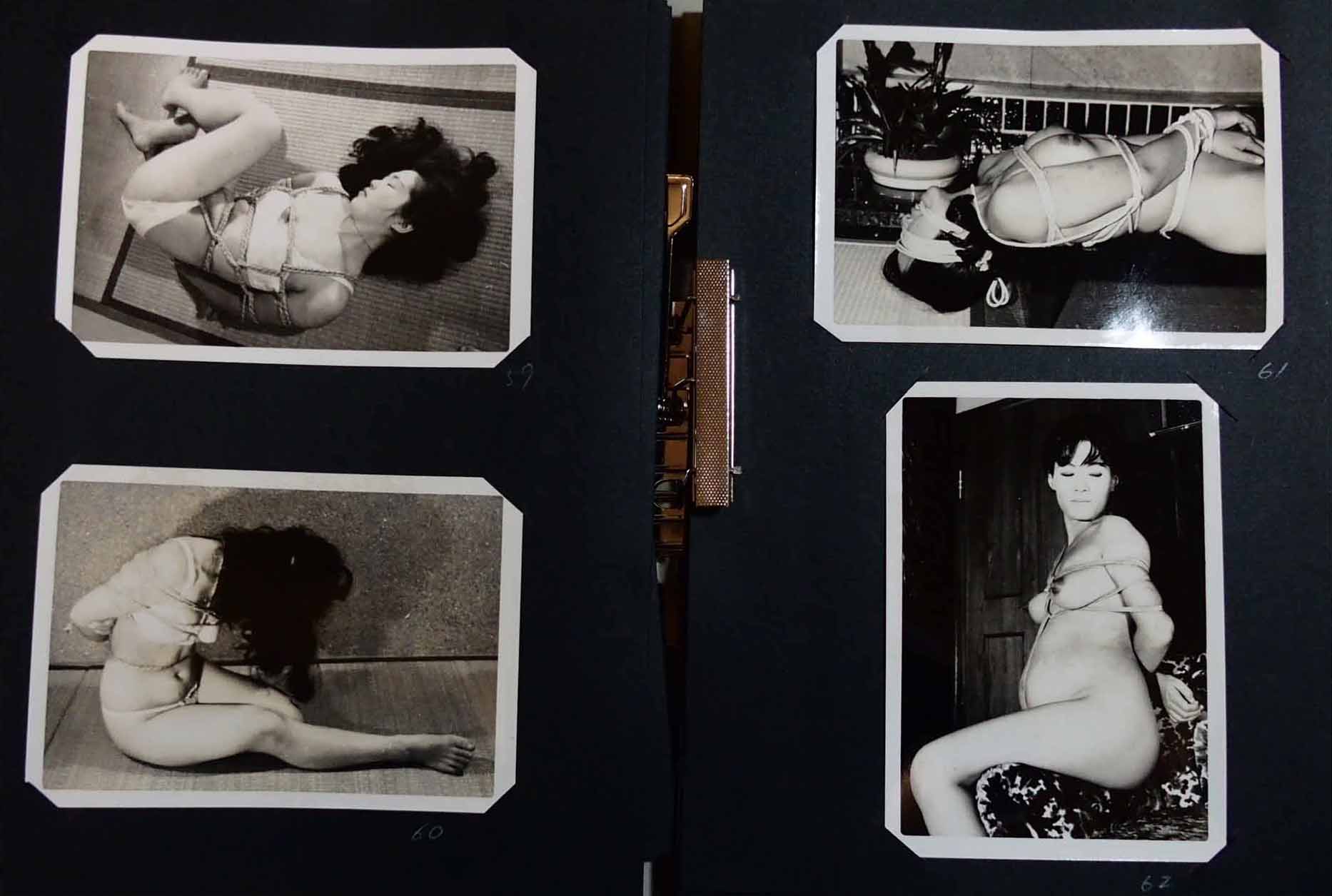68年10月号で発売された、新Z組「粒選り麗美女体緊縛力作写真」という。どこで区切っていいのかわからない組名(2文字づつ区切ればいい)なんですが、全100枚が全て特定されて揃っているので第1級資料と言えます。192の安井夫人や190のローズ秋山夫人の中にもZ組が混じっていると思われます。今までの私のいい加減な分類が根本的に問われる歴史的大発見とも言えそうですね。さて、その100枚ですが、この写真のように黒い画用紙を二つ折りして、四隅に切り込みを入れ、写真を挟んでバインダーに保管されていました。糊を一切使わず、保管状態も良く素晴らしいコレクションと思ったのですが、何が悪かったのか、黒画用紙の色素なのか酸なのか? もやもやしたシミが特に中間・明部に目立つ写真が多くありました。バライタ印画紙の完全な保管方法は、なかなか無いようです。