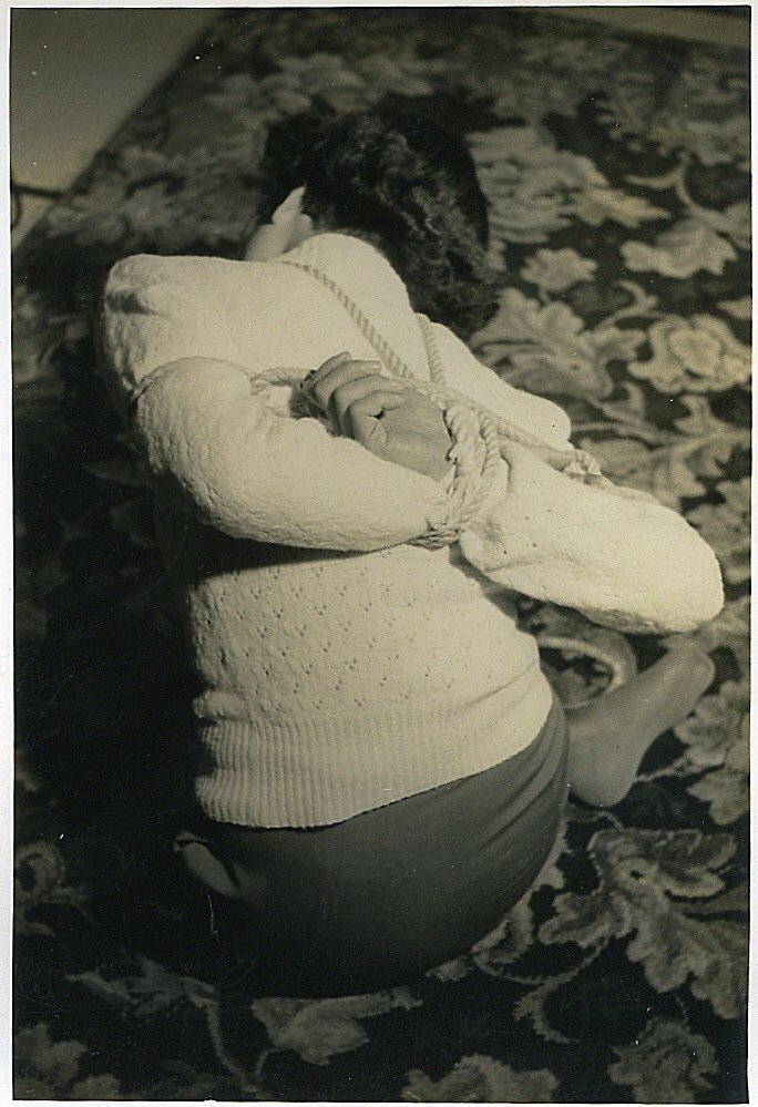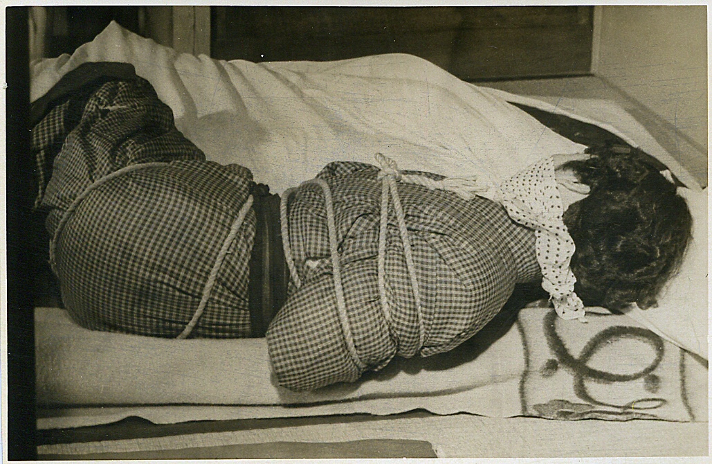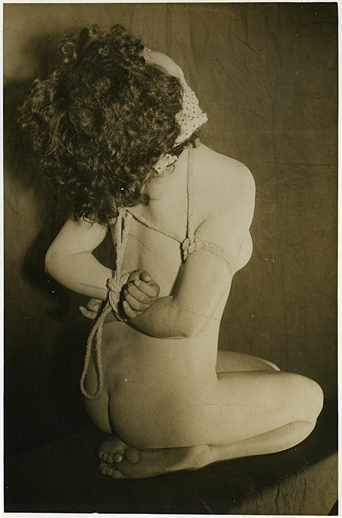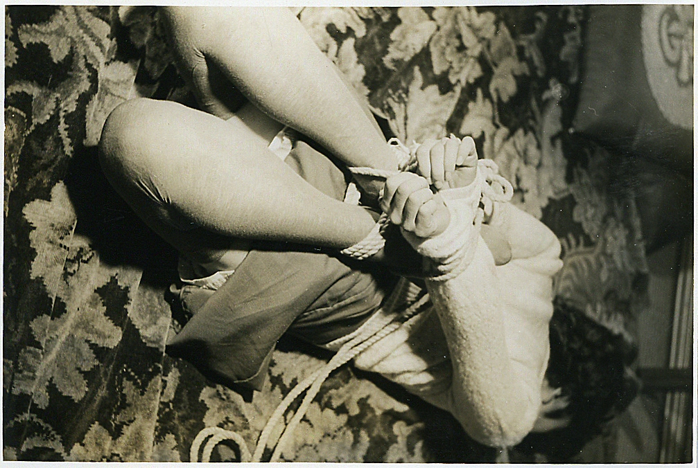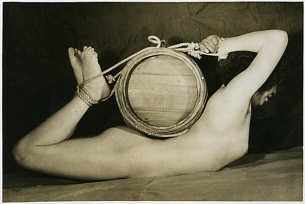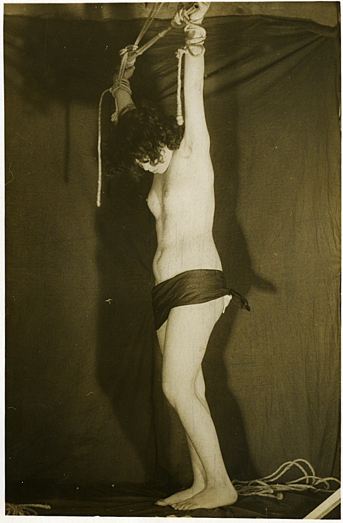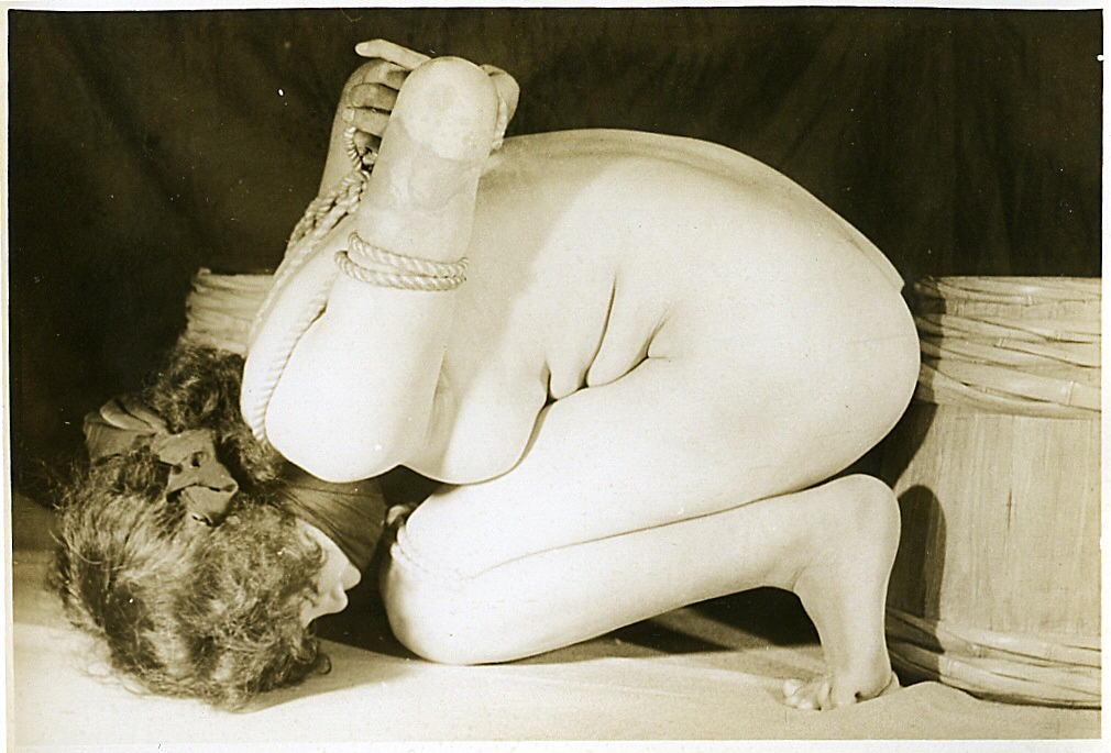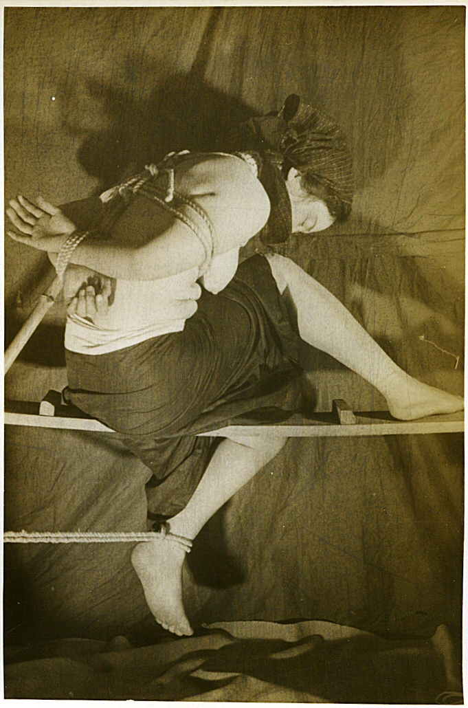 『卵を立てたような見事なポーズ、両手首と両足首とを縛って脈絡したところに安定感がある。白い肉体を前にしてこれから加えられるであろう呵責の幻想は、サディスト達を楽しませてくれる(辻村)』