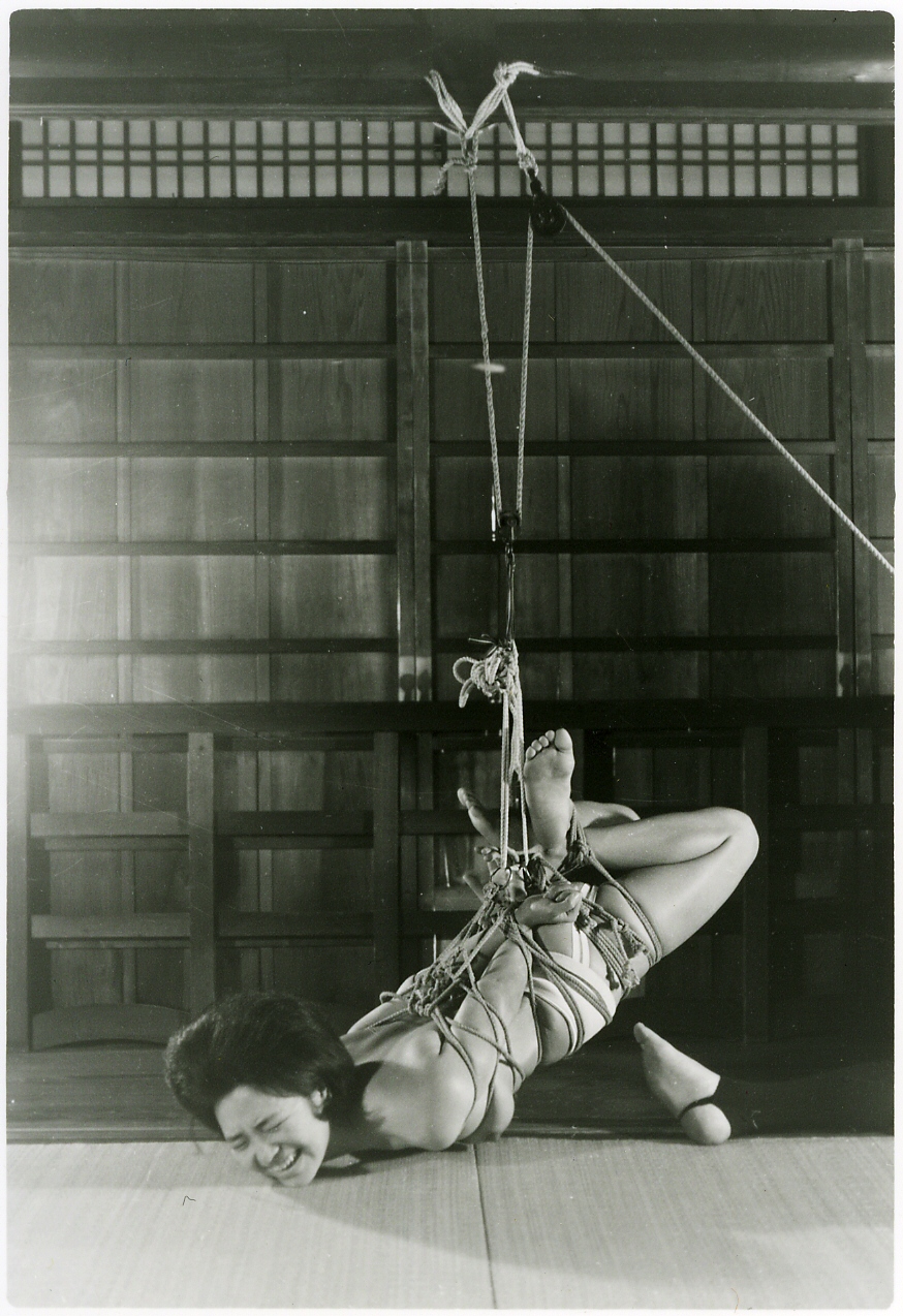 63年7月に発売された、3枚組(いの)のうちの一枚という見方も出来ます。(いの)の解説には「両手と両足を一緒に一つに括りまるで四つ足の動物を釣り下げるようにぶら下った梨花嬢。全身を無防備の中に放置して、浣腸、擽り等々あらゆる責めの触手にさらしている吊り責の法悦境」とあります。
