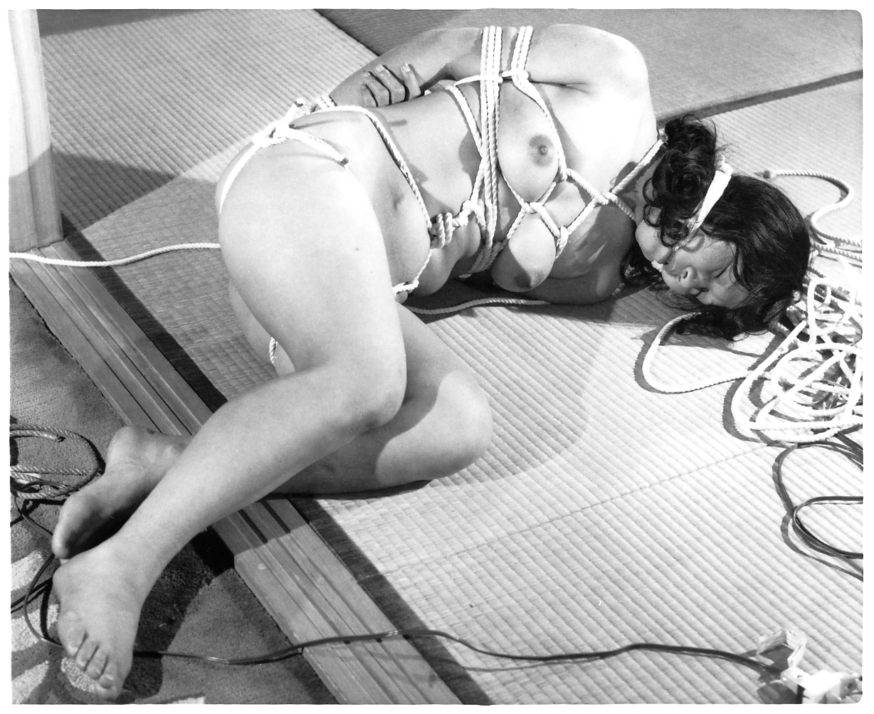 111-2b) Mrs.K.YASUI-2 / (おふ)安井喜久子夫人の2略号(おふ)なら68年1月号の『猿轡の裸身を晒す』大手札4枚組。解説は、「猿轡の布片以外は一糸もまとわぬ裸身に肌もくびれるばかり厳しく掛った縄は流石にM夫人だけあって素晴しい喰い込みをする。」