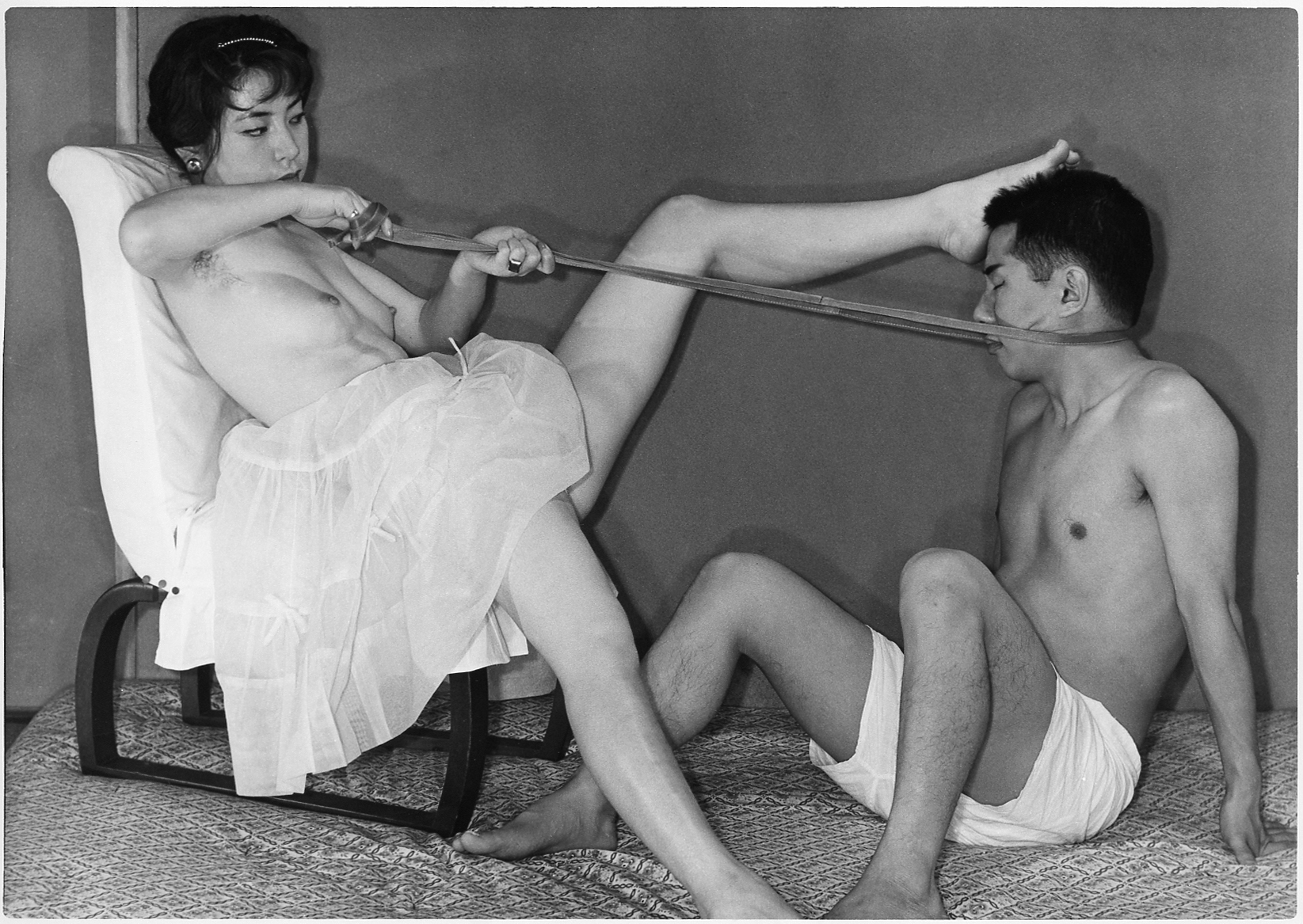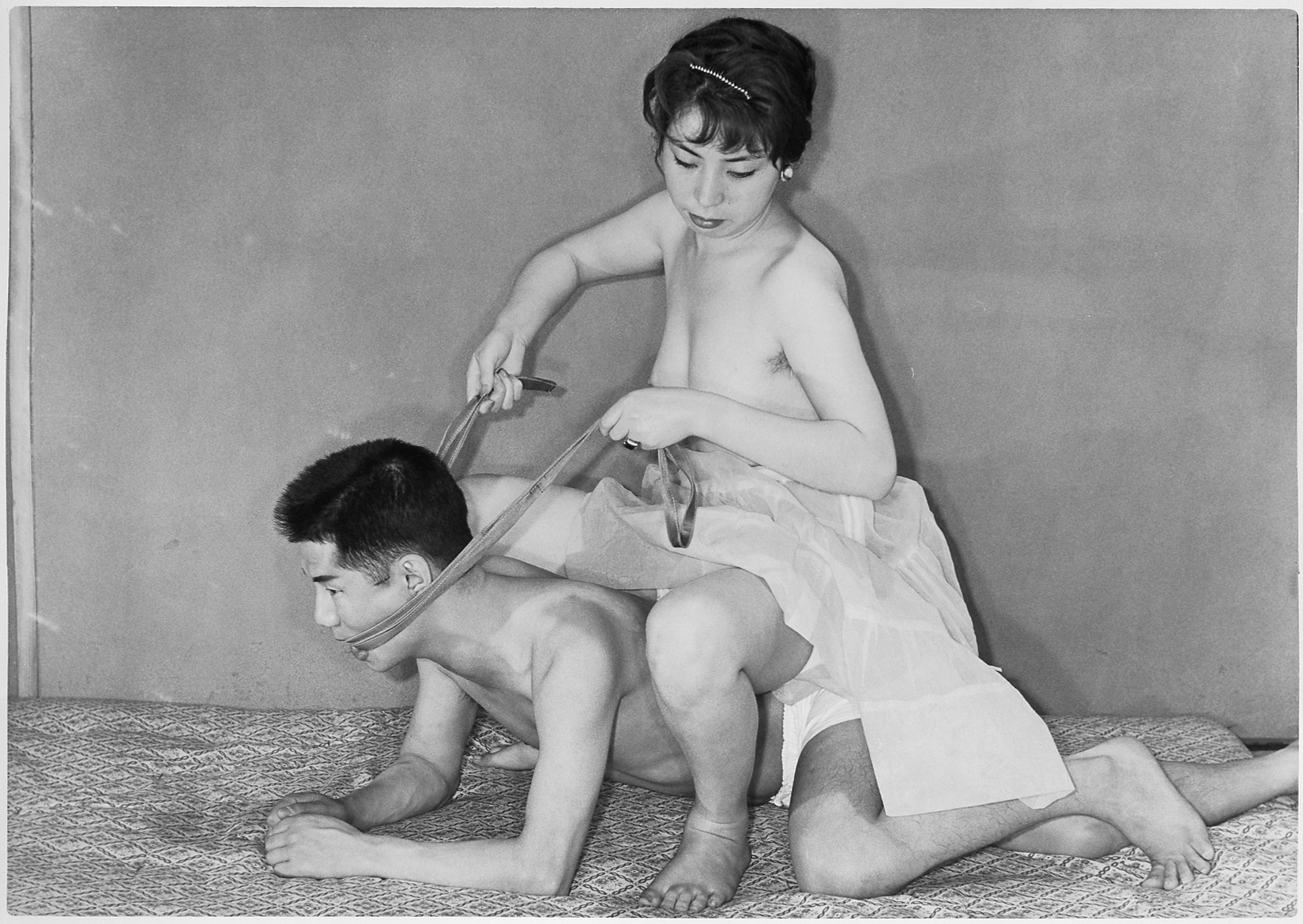 4枚組ですが女王様がずいぶんお洒落なさっています。モデルは判りにくいのですが絹川文代嬢かと。絹川嬢でしたら最初に分譲されたのが58年12月号です。61年8月号でマゾ写真の女王様役。その時の相方は海野弘三で、この写真は小沼正三を相手にした62年1月号の(ひあ)+(ひめ)各2枚組かと思いますが、よくわかりません。