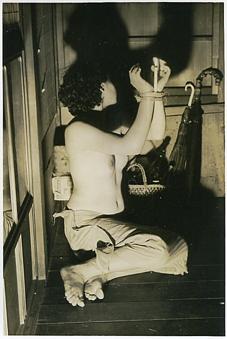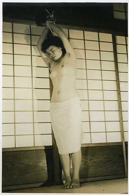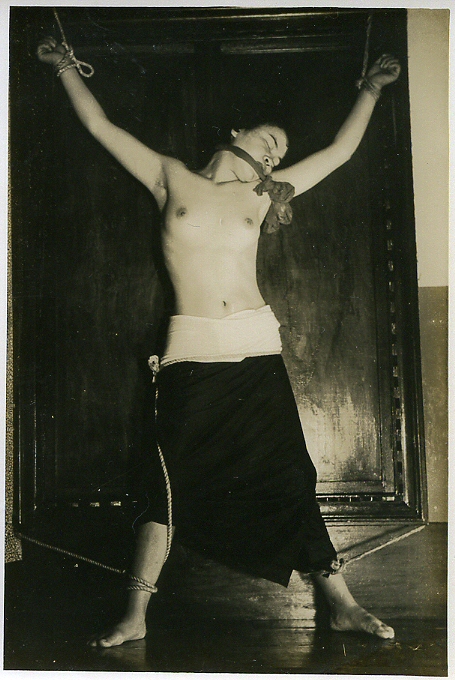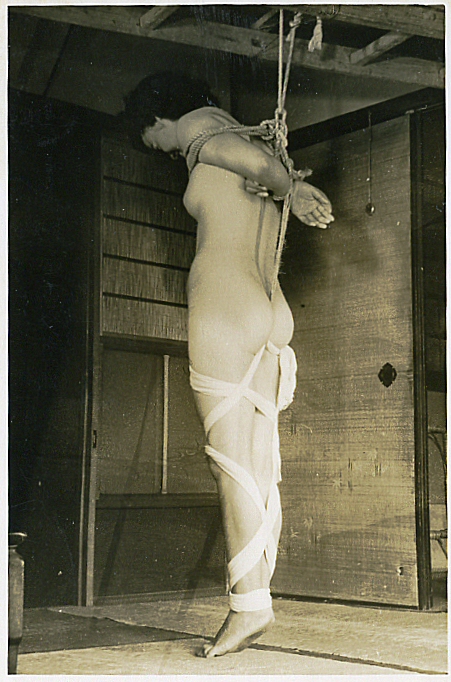 確証はありませんが、59年の2月号初出、略号(きり)3枚組の1枚と思われます。表題『緊縛全裸立姿』、解説「後手にきりきりと縛しめられた全裸の立姿は麗しくも神々しく我々の目に輝く。」とあります。何かしら、お隣の国の首領様のような表現ですね。