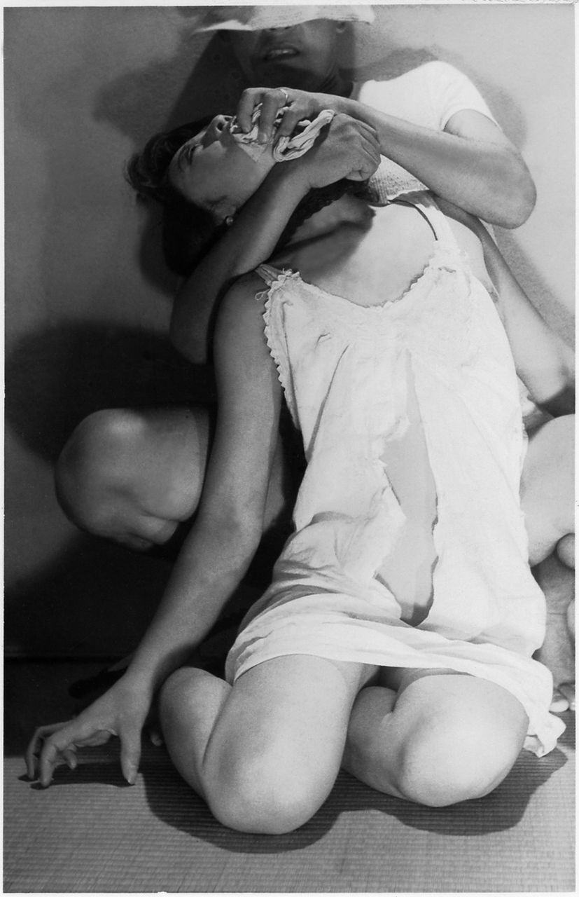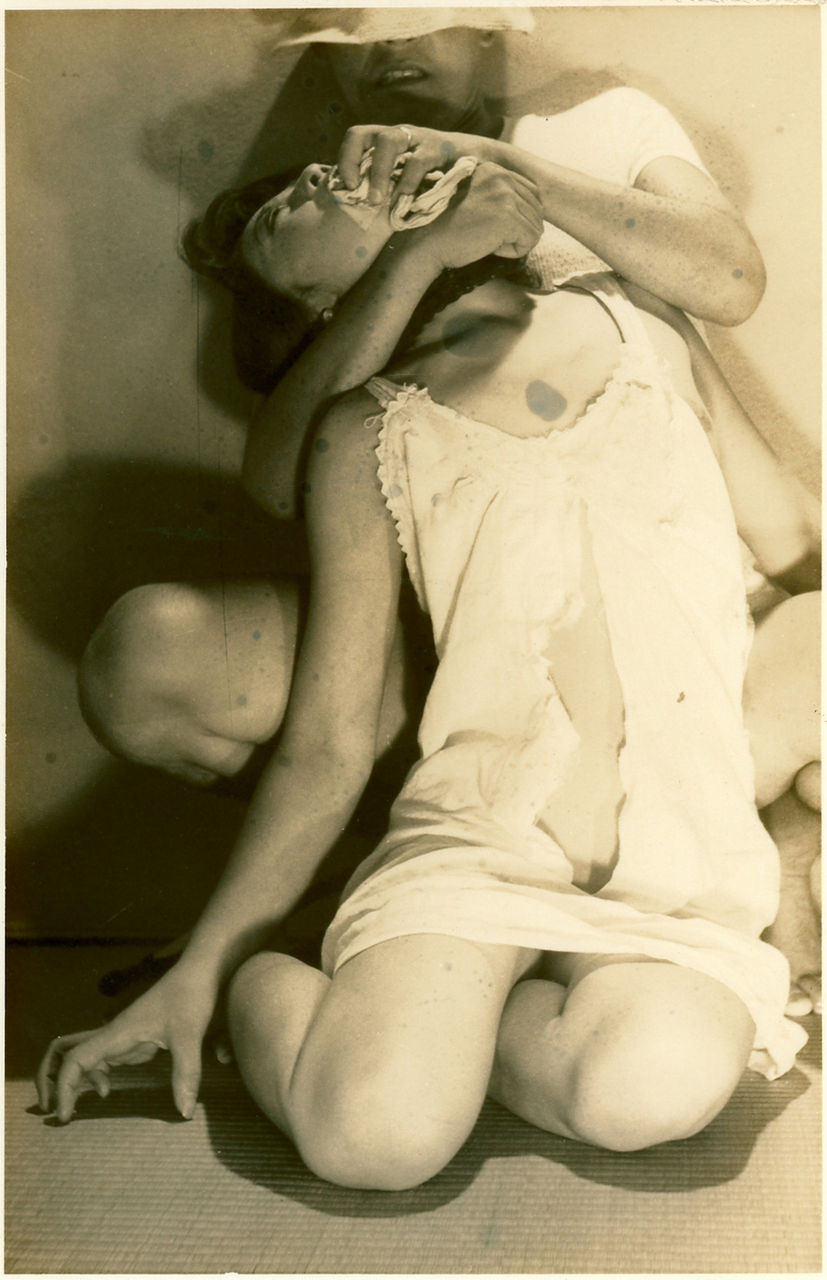 写真の裏に(ひか)と書き込みがあります。それなら、61年5月号でアナウンスされた 『東浦ひかる悦虐図絵』 略号(ひか)3枚組に間違いないでしょう。解説は 「辻村隆の今月号掲載「私を責めて下さい」の主人公である典型的なマゾヒスト、その強烈な緊縛をお楽しみ下さい。」 となっています。