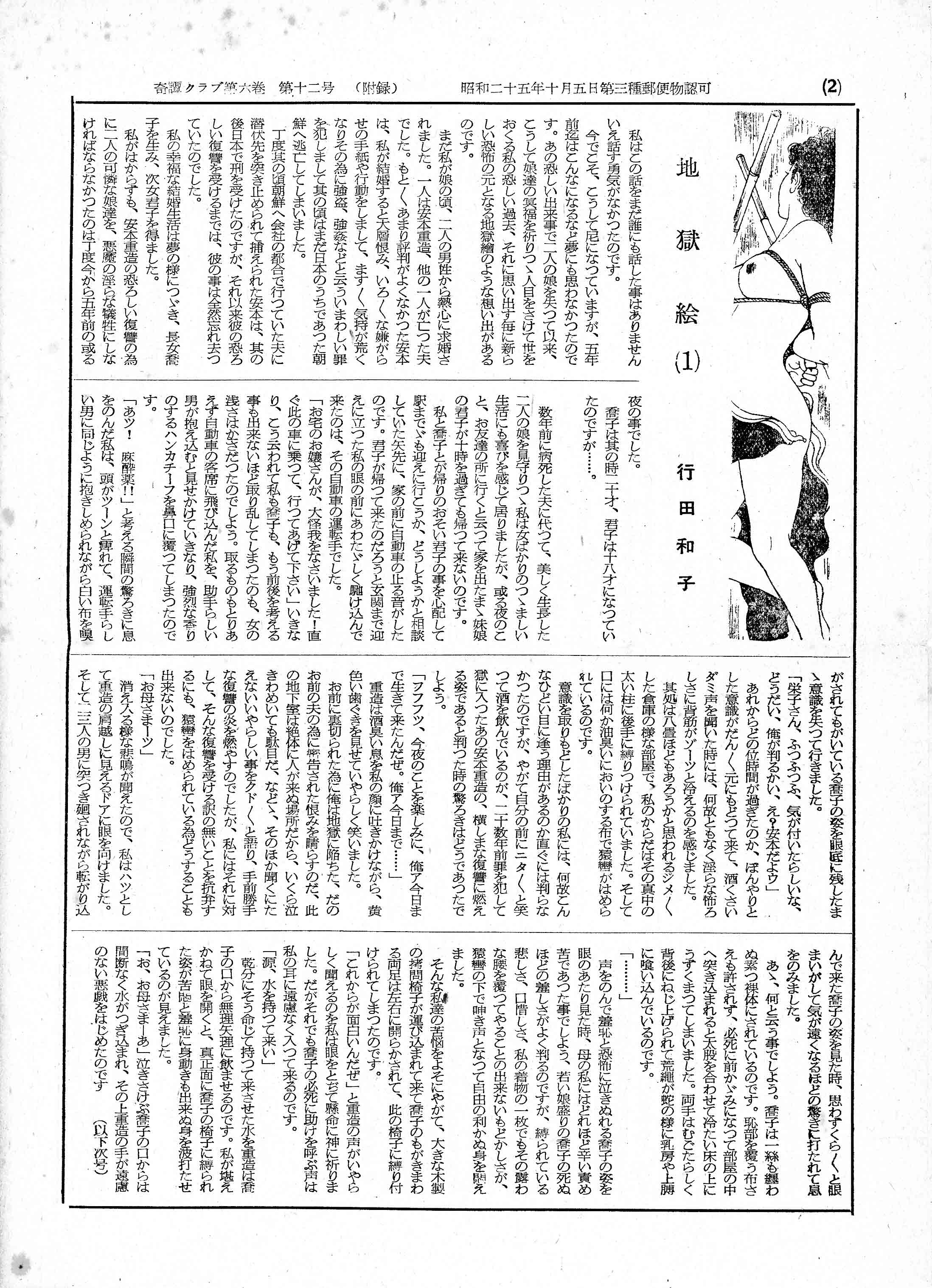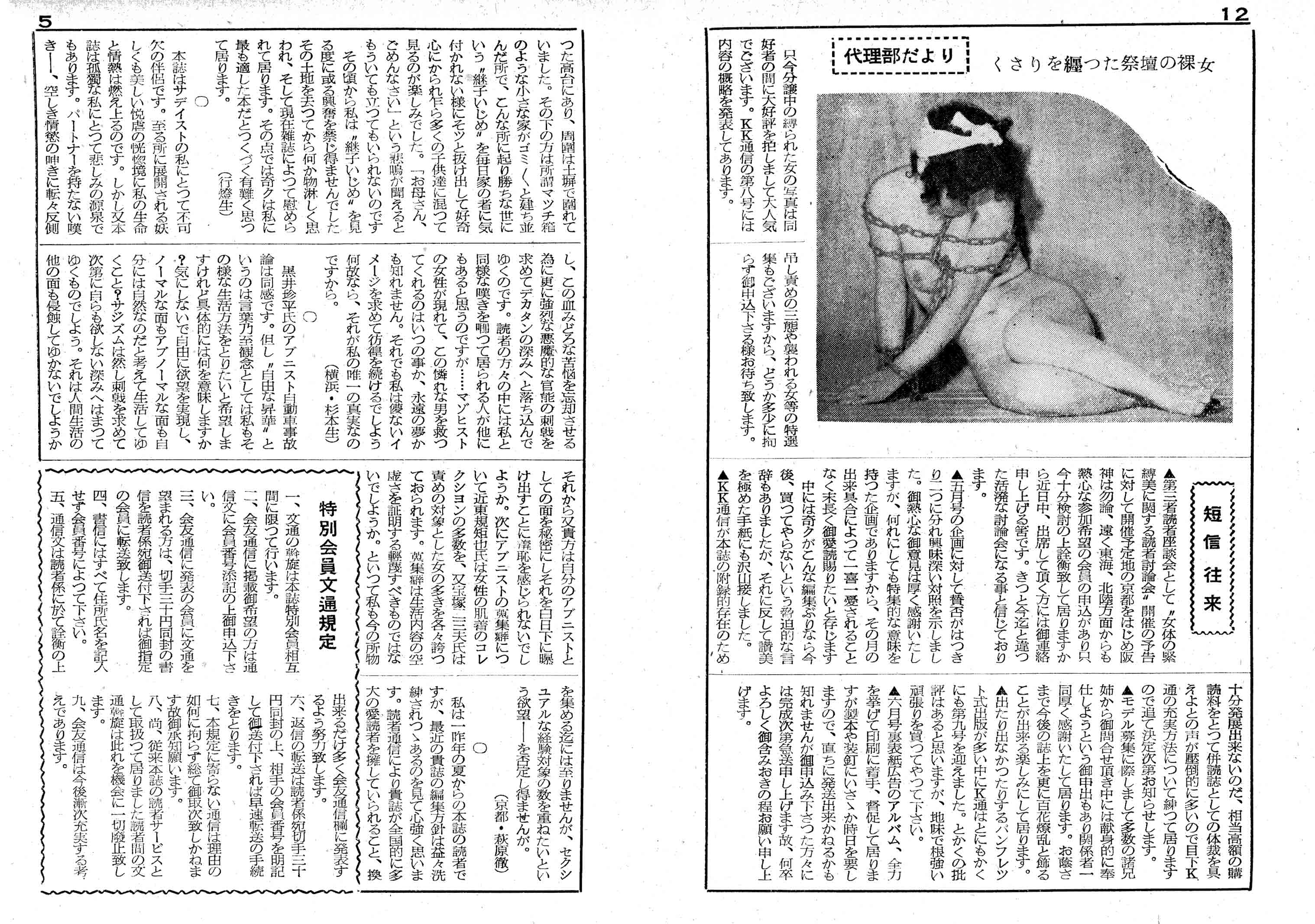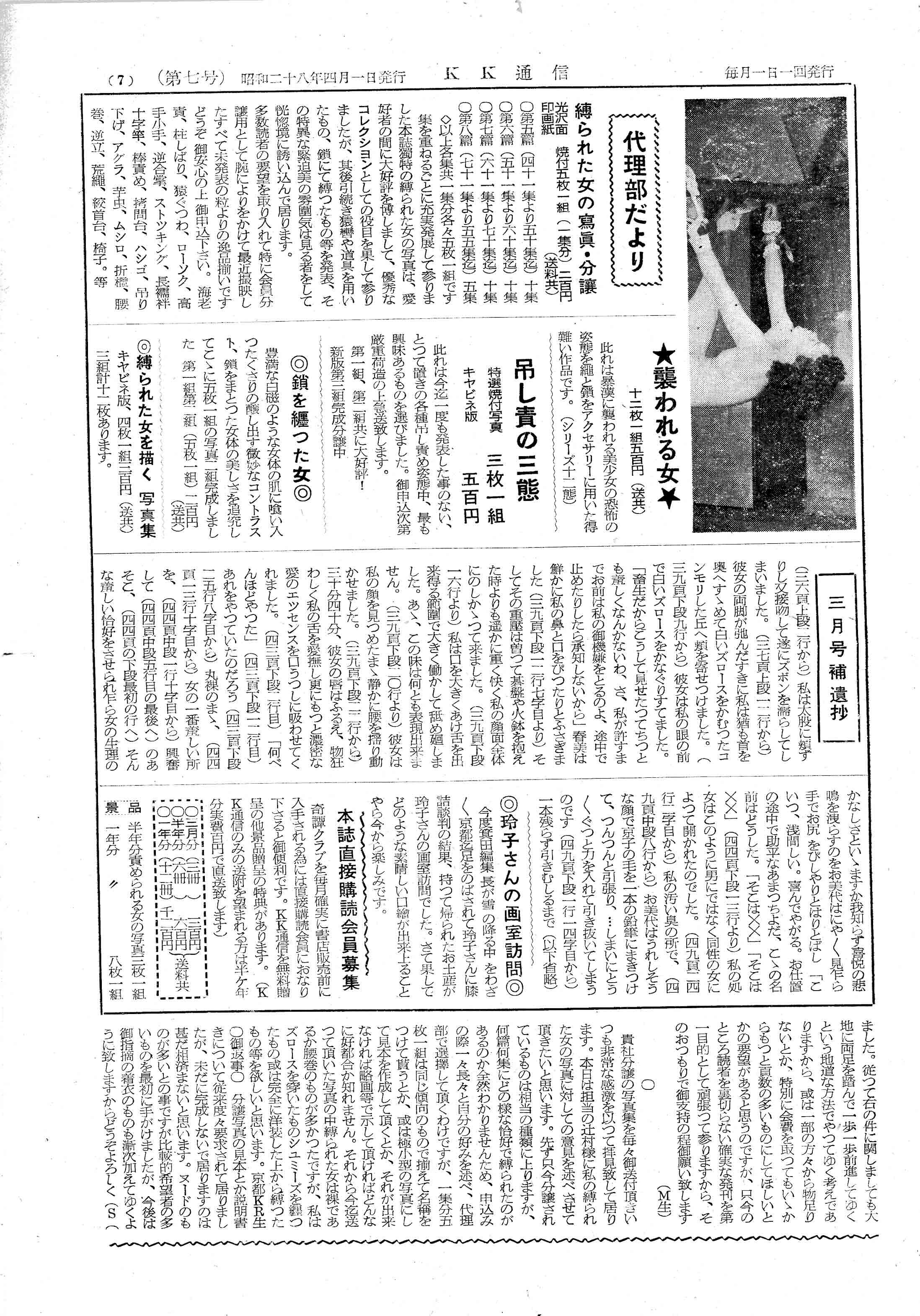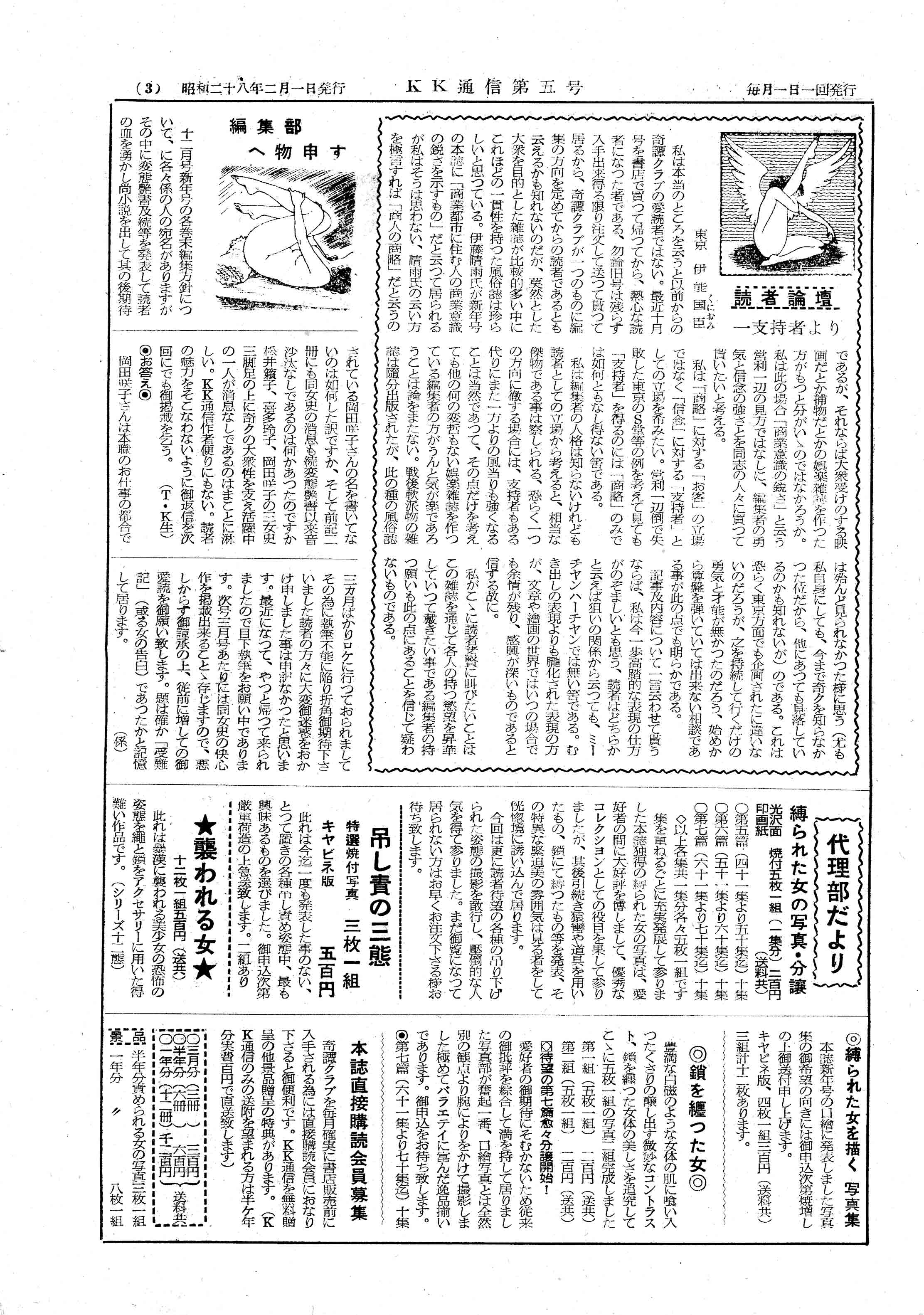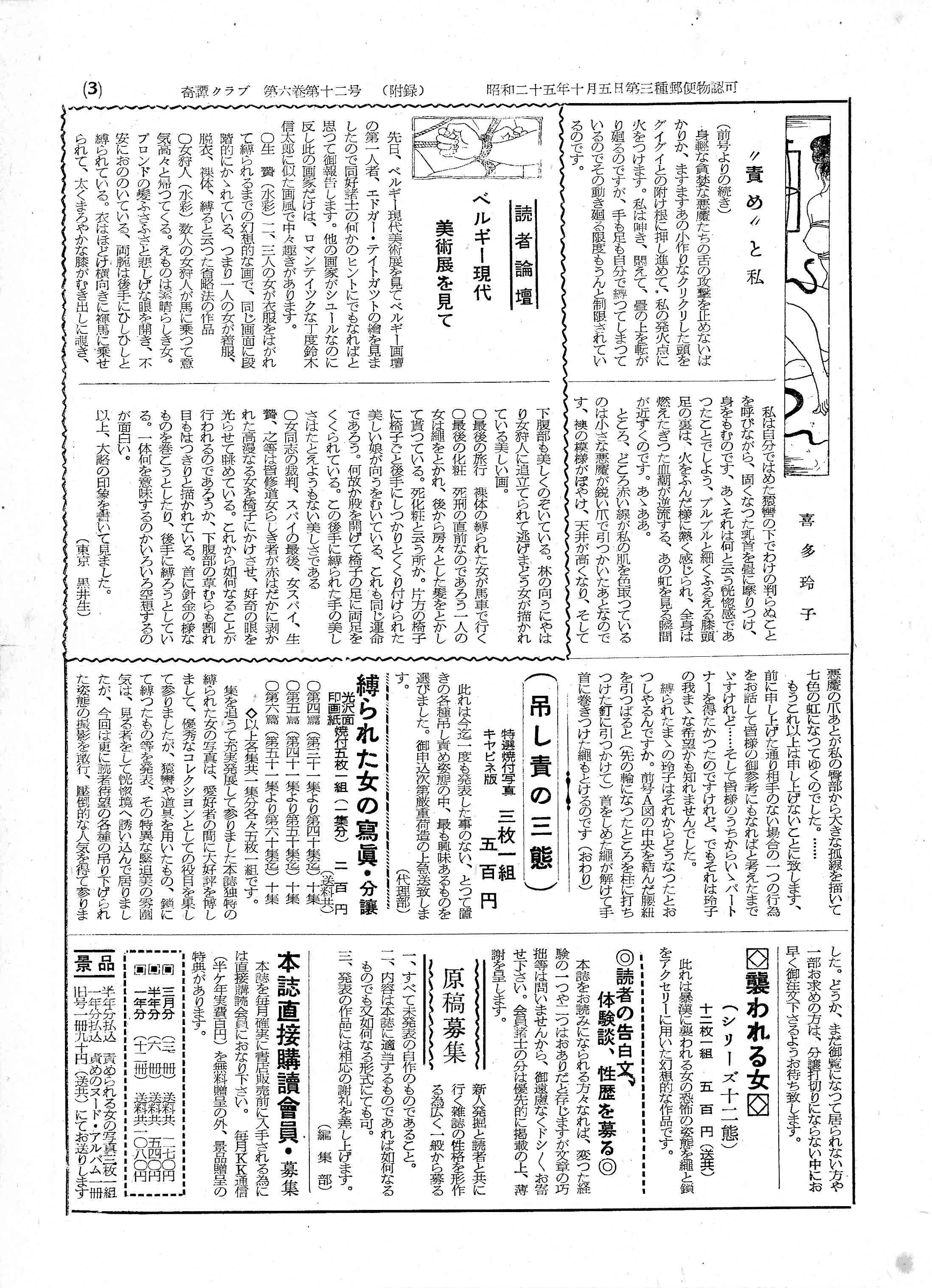 そして、この第3号は『奇譚クラブ第6巻第12号附録』と発行タイトルにあります。付録という以上、この号だけは12月号に挟み込まれて売られたのでしょうか? 分譲写真目録では56年12月号でそんな例がありました。